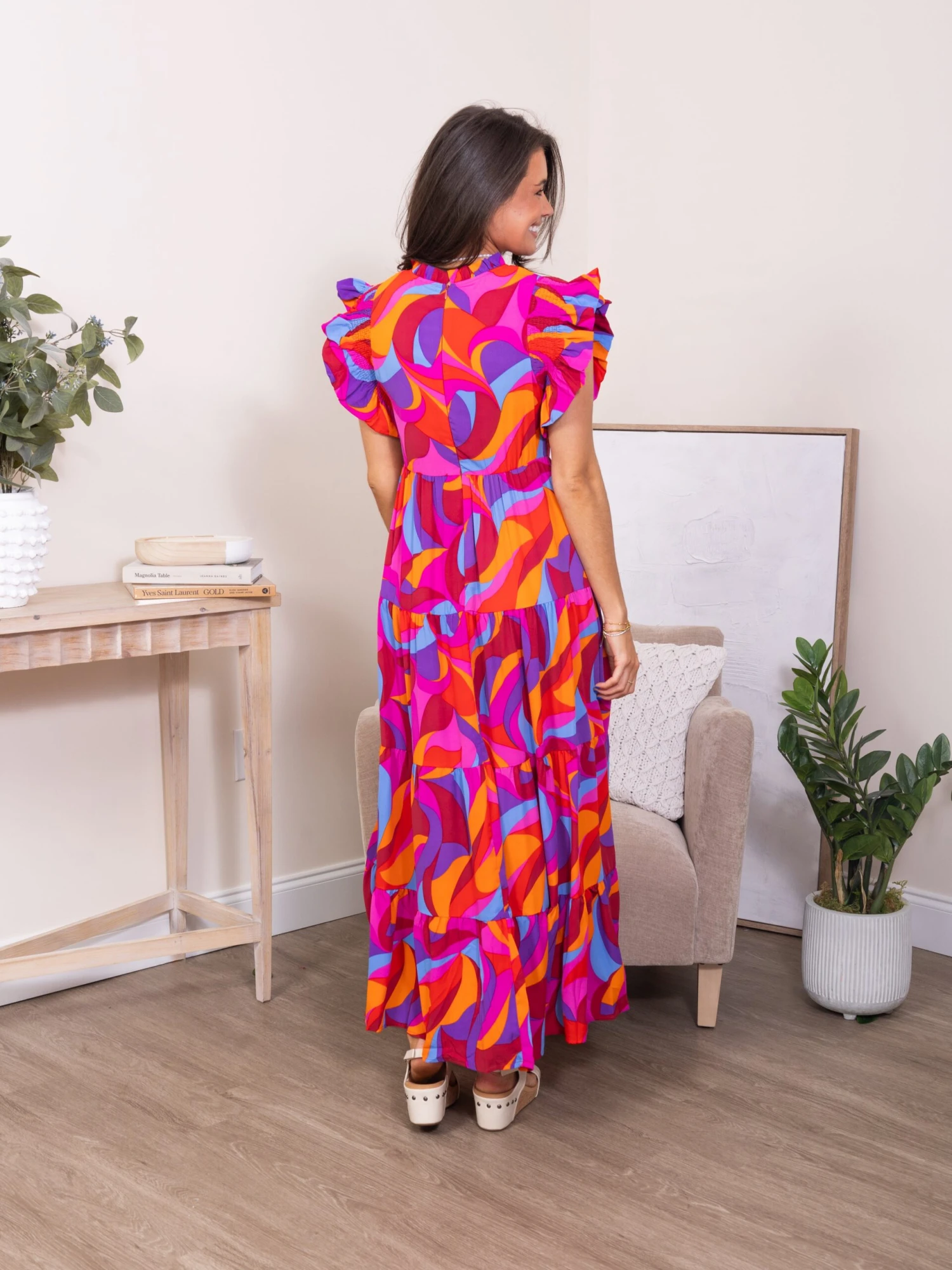 Features: ruffle neck, ruffle sleeve, short sleeve, tiered