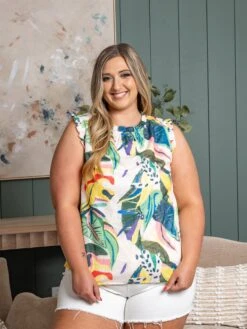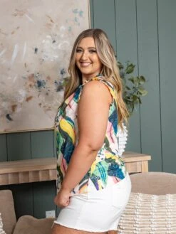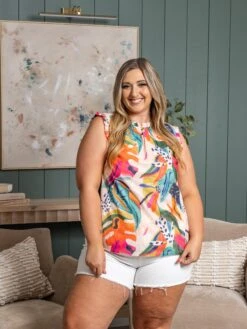 Features: Ruffle Neck, Sleeveless, Lined, Printed