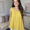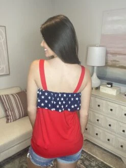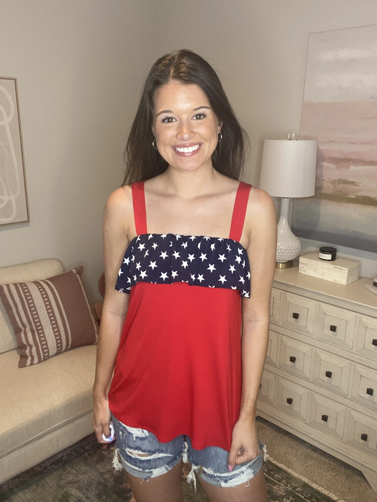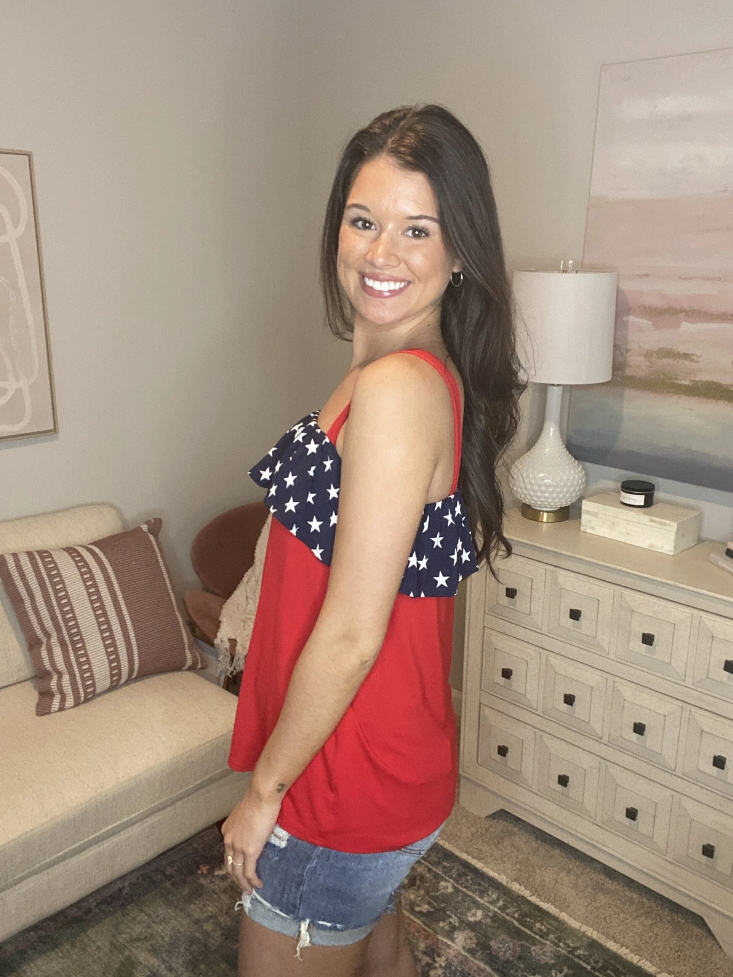 The “Amber Waves Of Grain Top” has arrived! This star print and ruffle tank top is a must have! With a sleeveless design, you cannot go wrong here! This one is perfect for the summer! Snag one before they sell out, you know they will!
