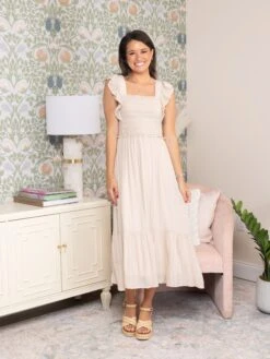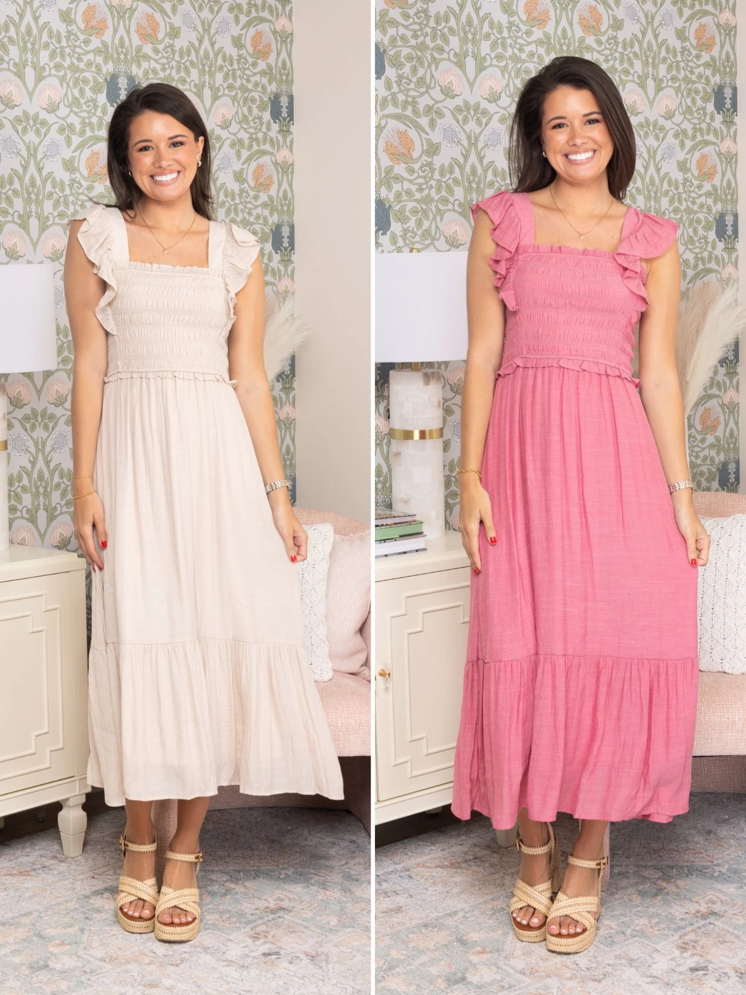 Features: Smocked Bodice, Ruffled Short Sleeve, Square Neck, Midi