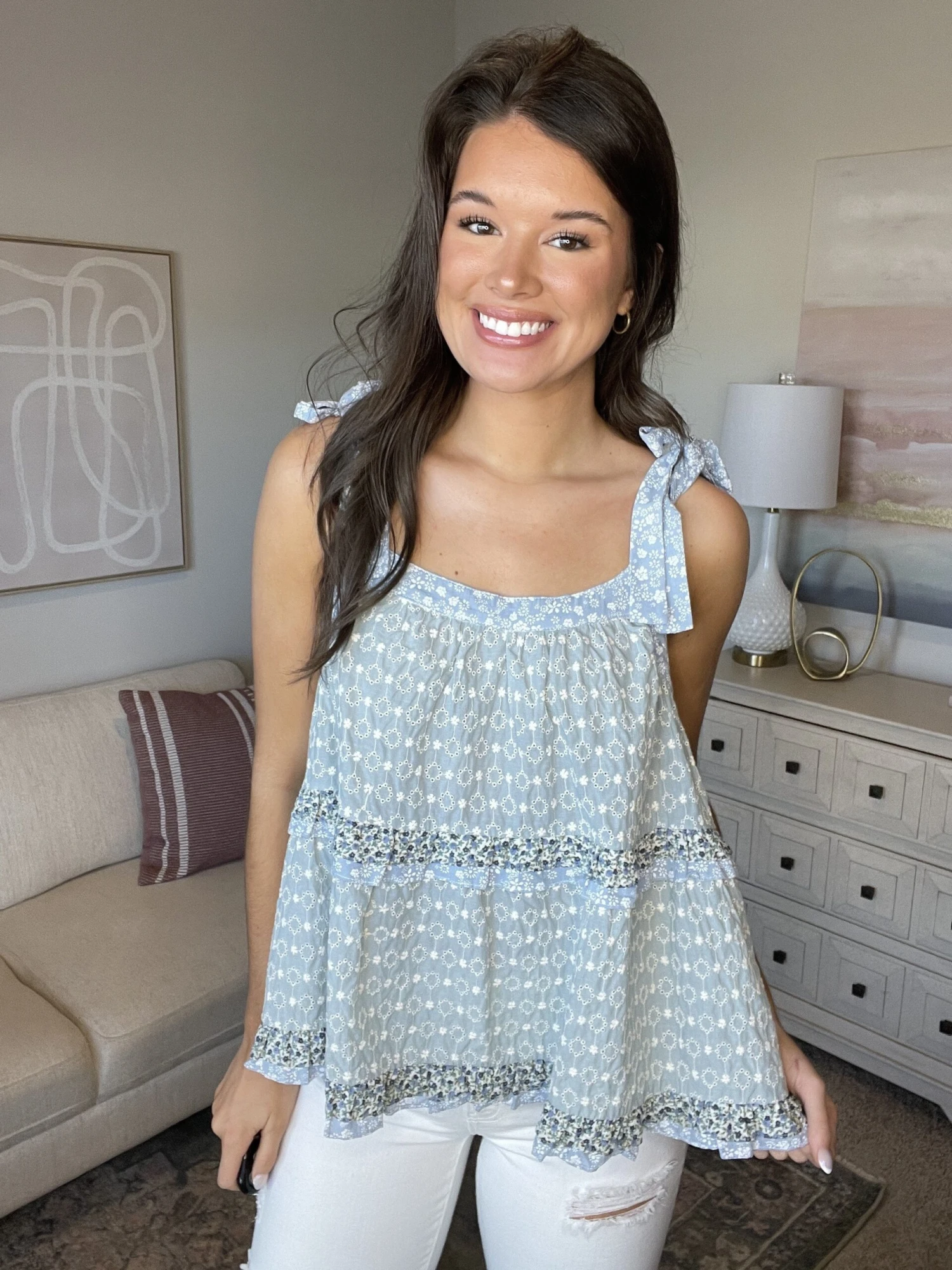 The “Backyard Cookout Top” has arrived! This super cute sleeveless top is just what you need this summer! With the eyelet lace, you can’t go wrong! Be sure to snag one before they are gone!
