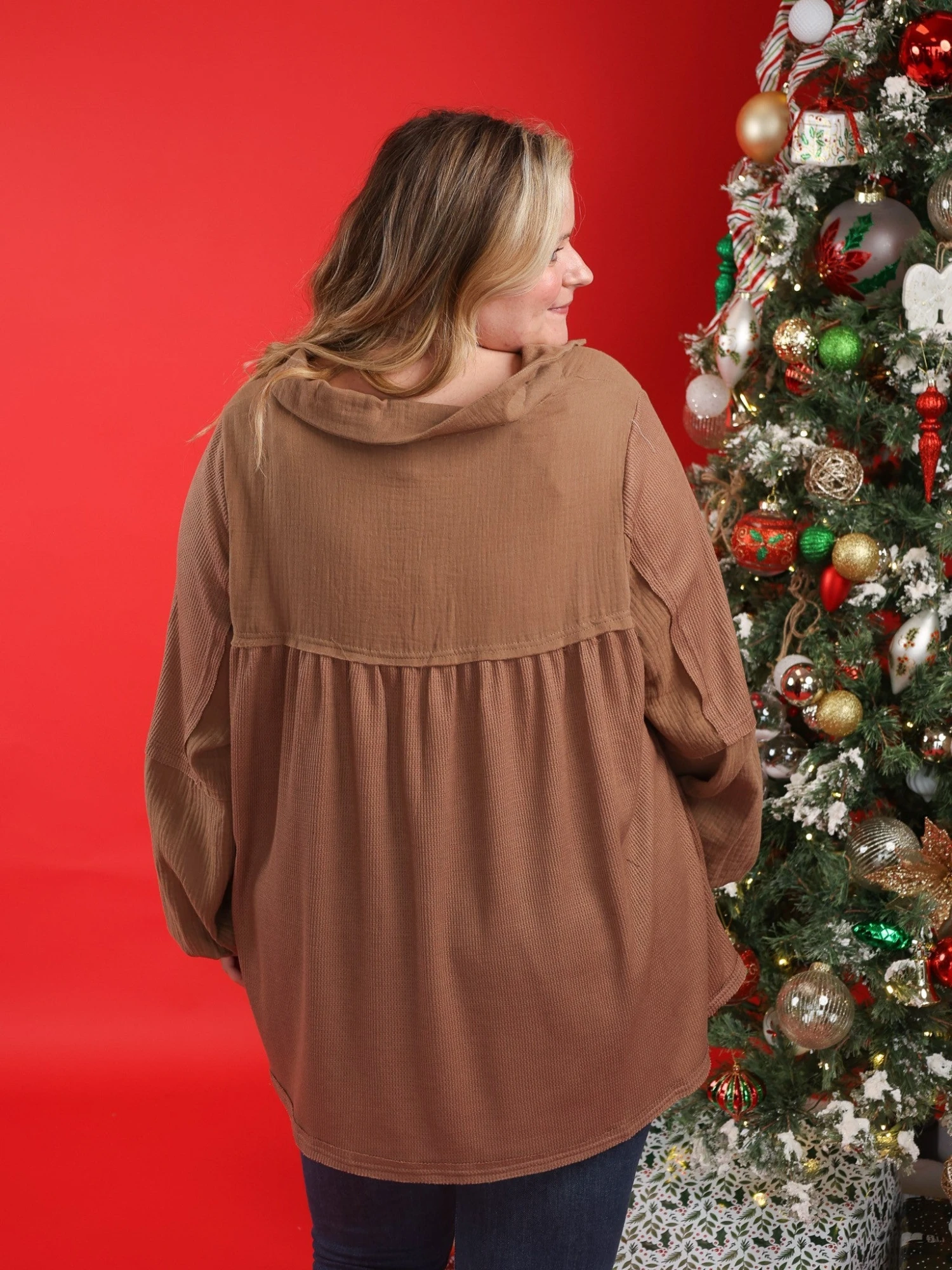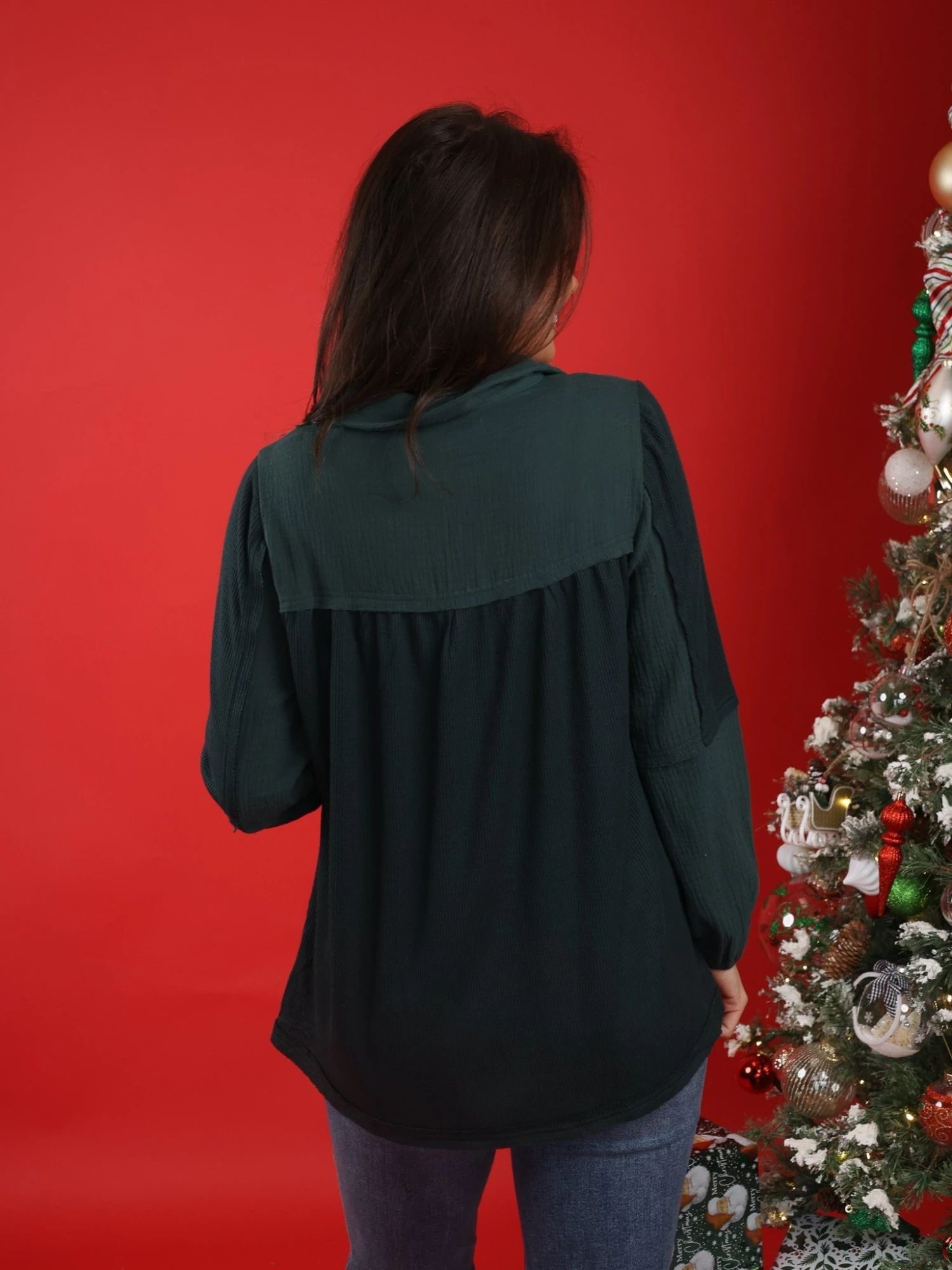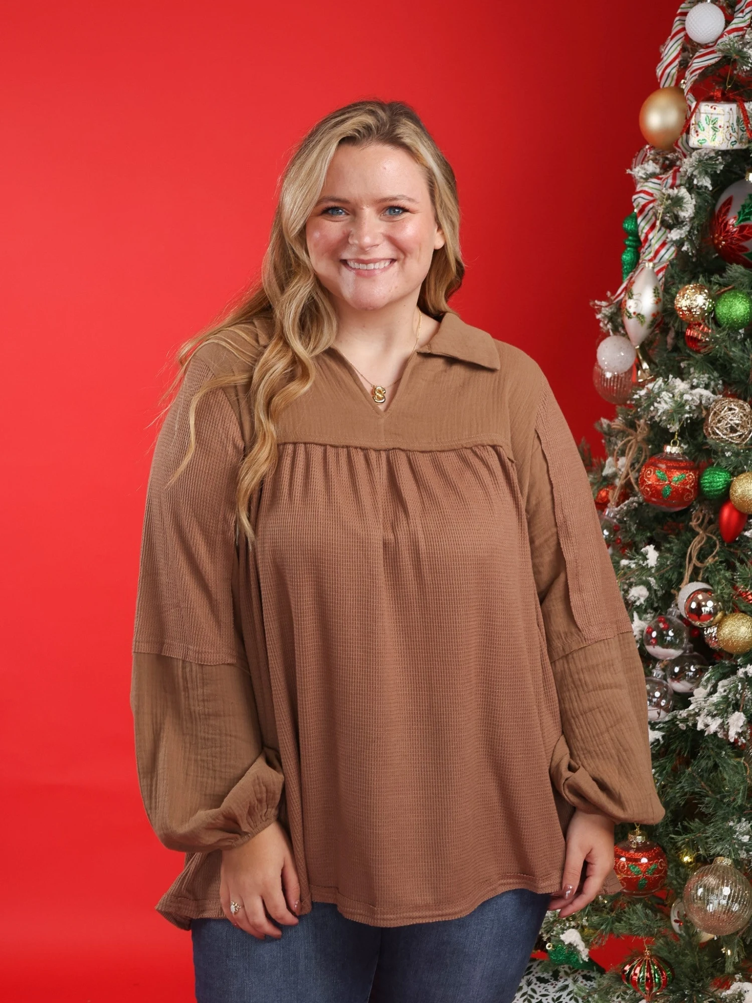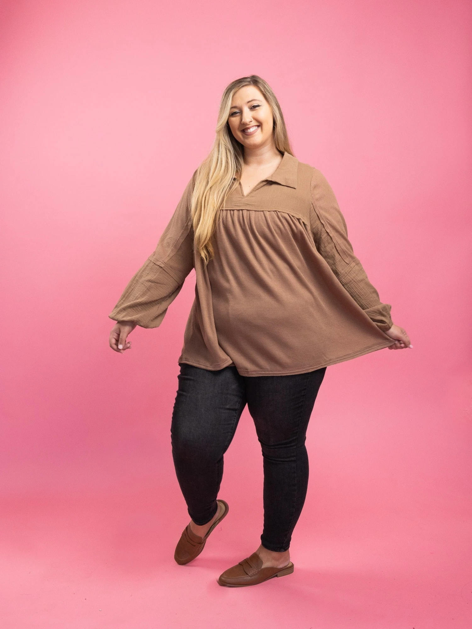 Erin is 5’9, typically 14-16 in denim, Large-X-Large in tops, 36C bra. Wearing size 1X.
