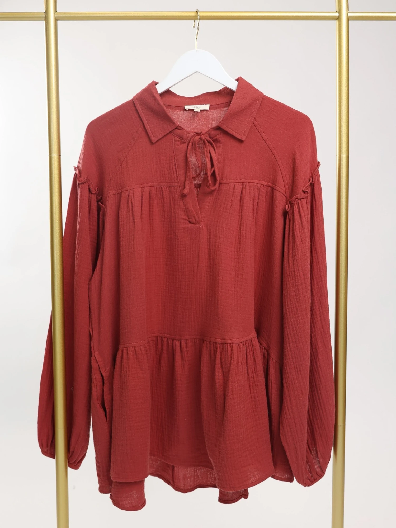 Features: Long Sleeves, Tiered, Tied V Neck, Collared