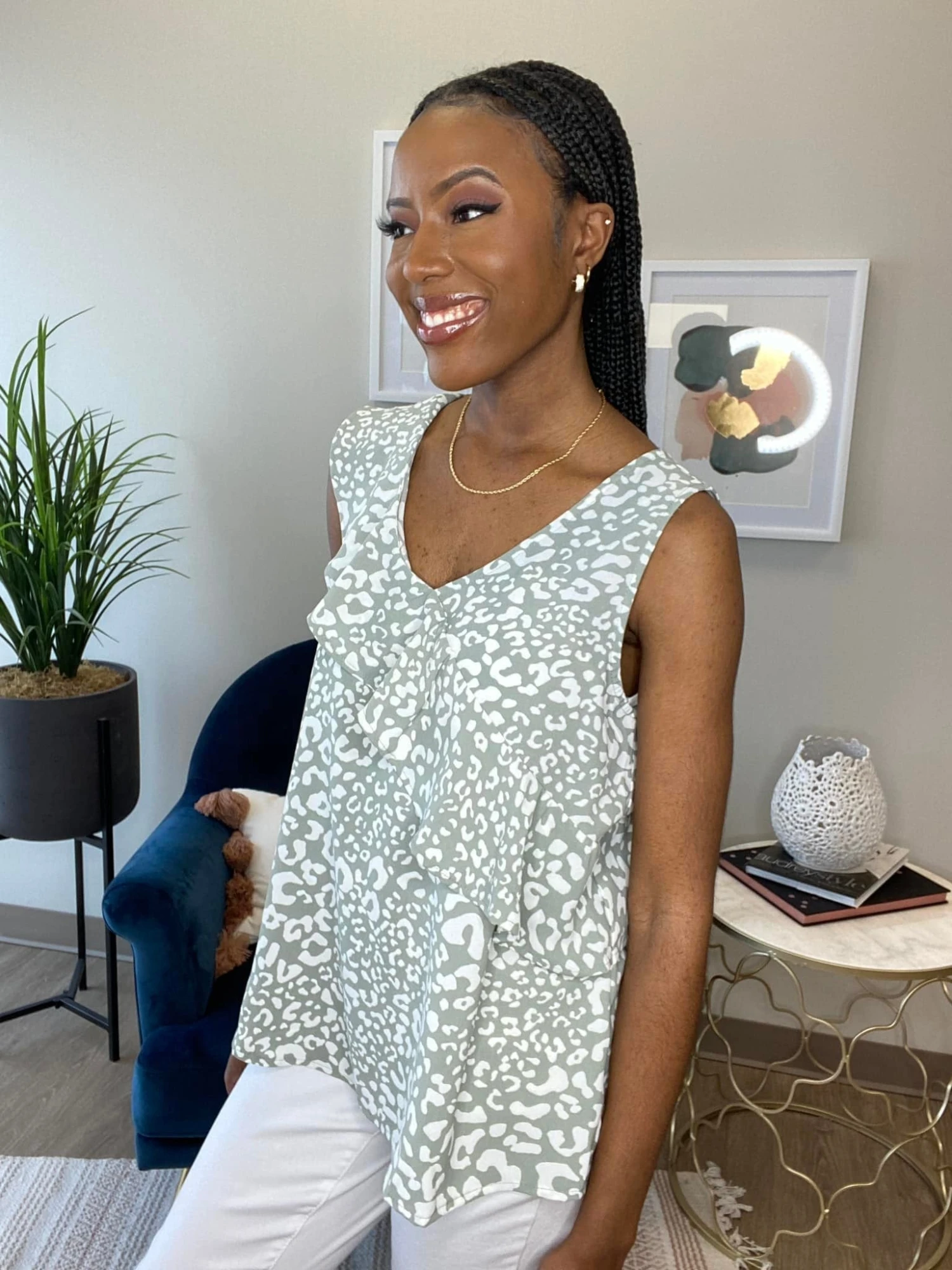 The “Crushing On You Top” has arrived! This leopard print tank is calling your name! With ruffle details, you cannot go wrong here! So stylish, this one is perfect for the spring and summer seasons! Snag one today!