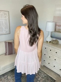 Features: round neck, sleeveless, tiered back hem