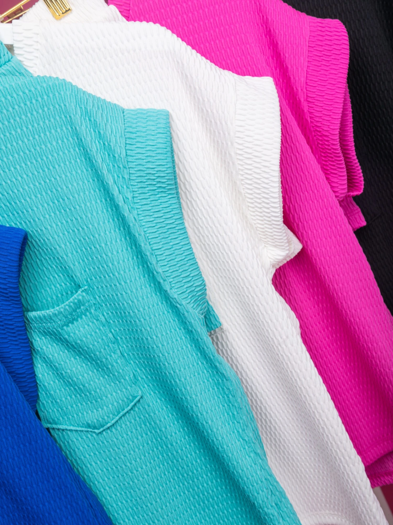 Features: Round Neck, Short Sleeves, Textured, Chest Pocket