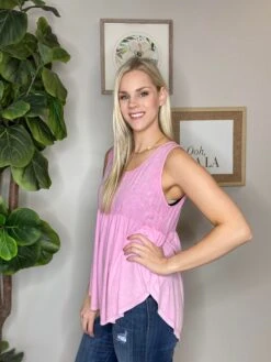Features: solid mineral washed print, sleeveless, raw hem, ribbed detailing