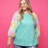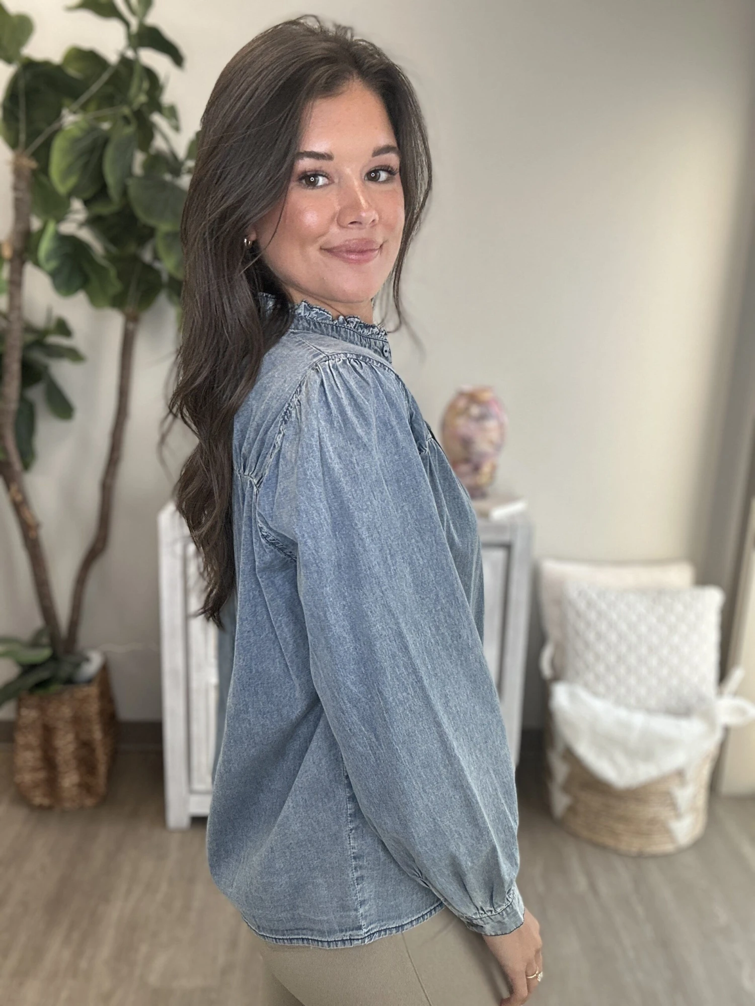 Features: Ruffle Neck, Long Sleeves, Button Down