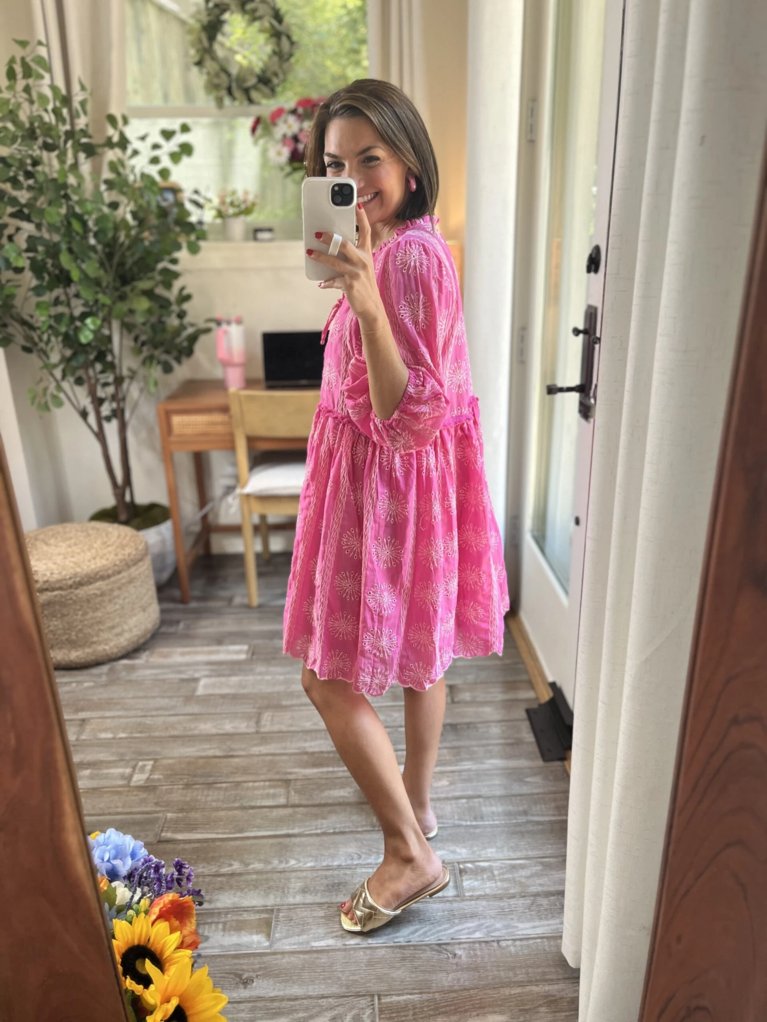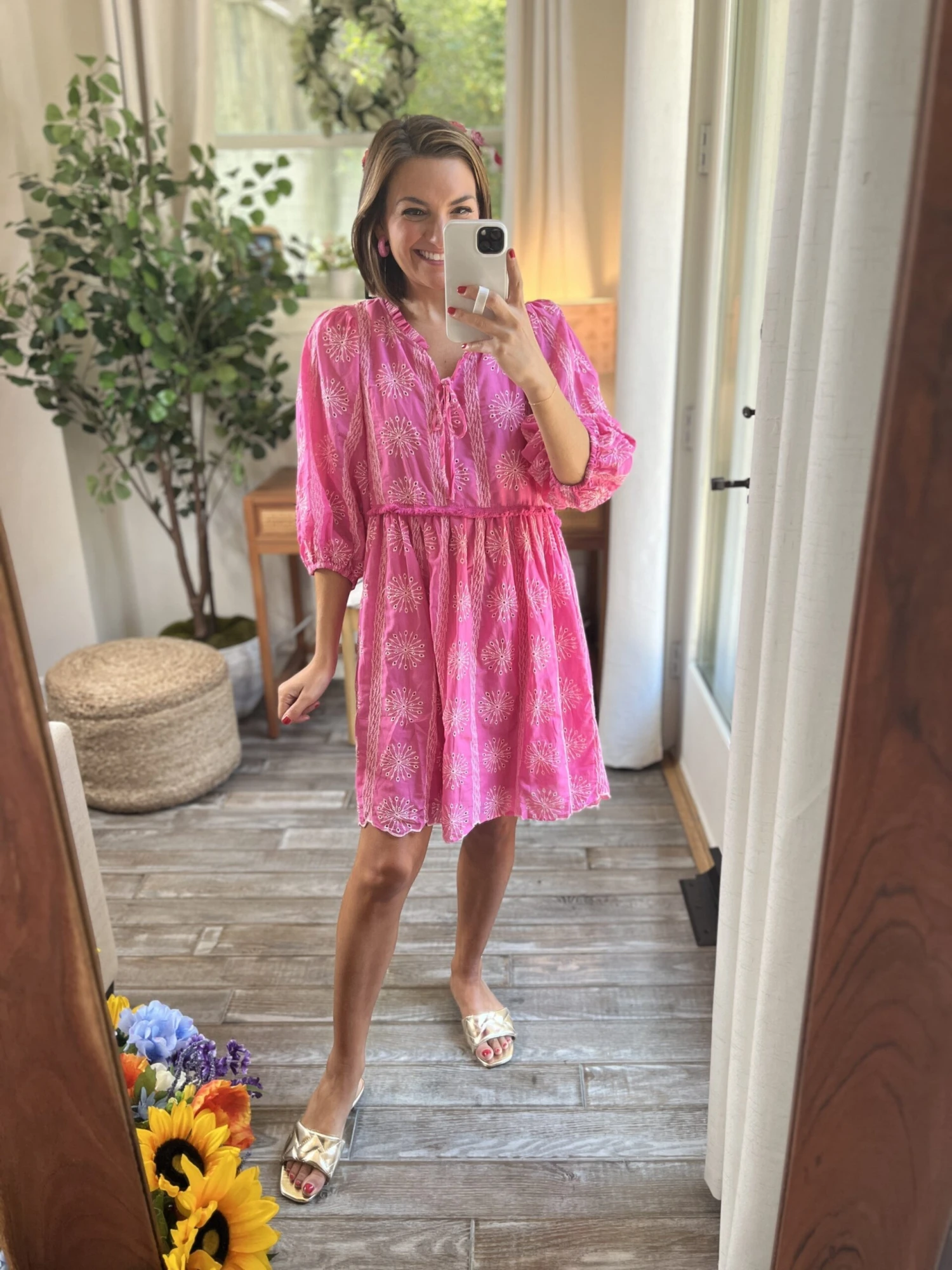 Features: solid print w/ embroidery detail, v neck w/ tie, 3/4 sleeves, scalloped hem