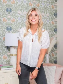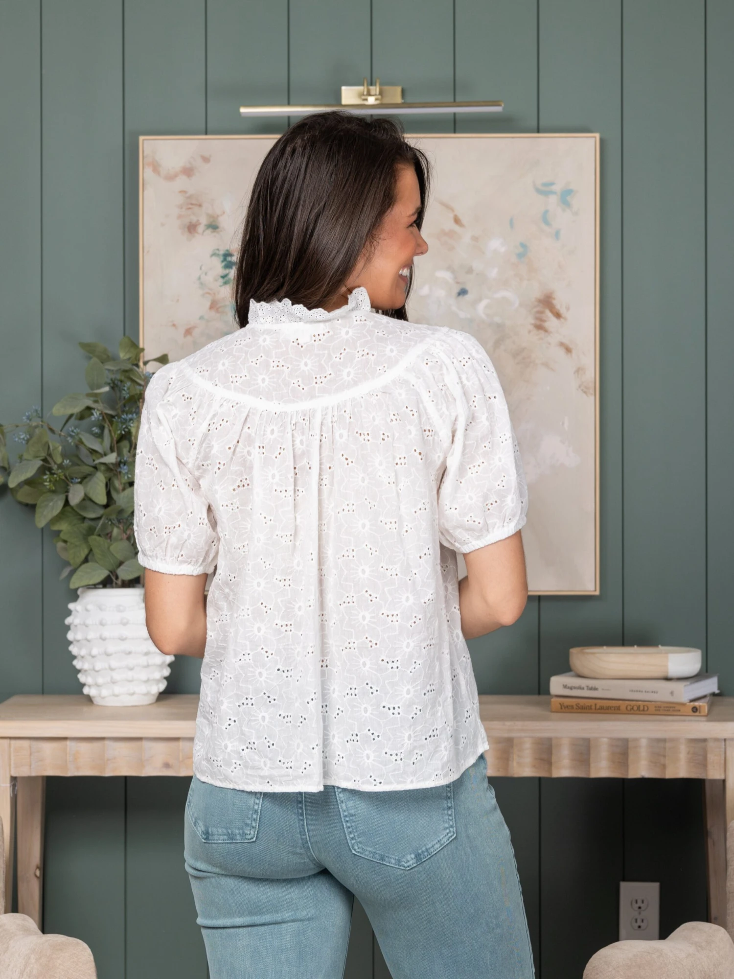 Features: Ruffle Neck, Short Sleeves, Button Down