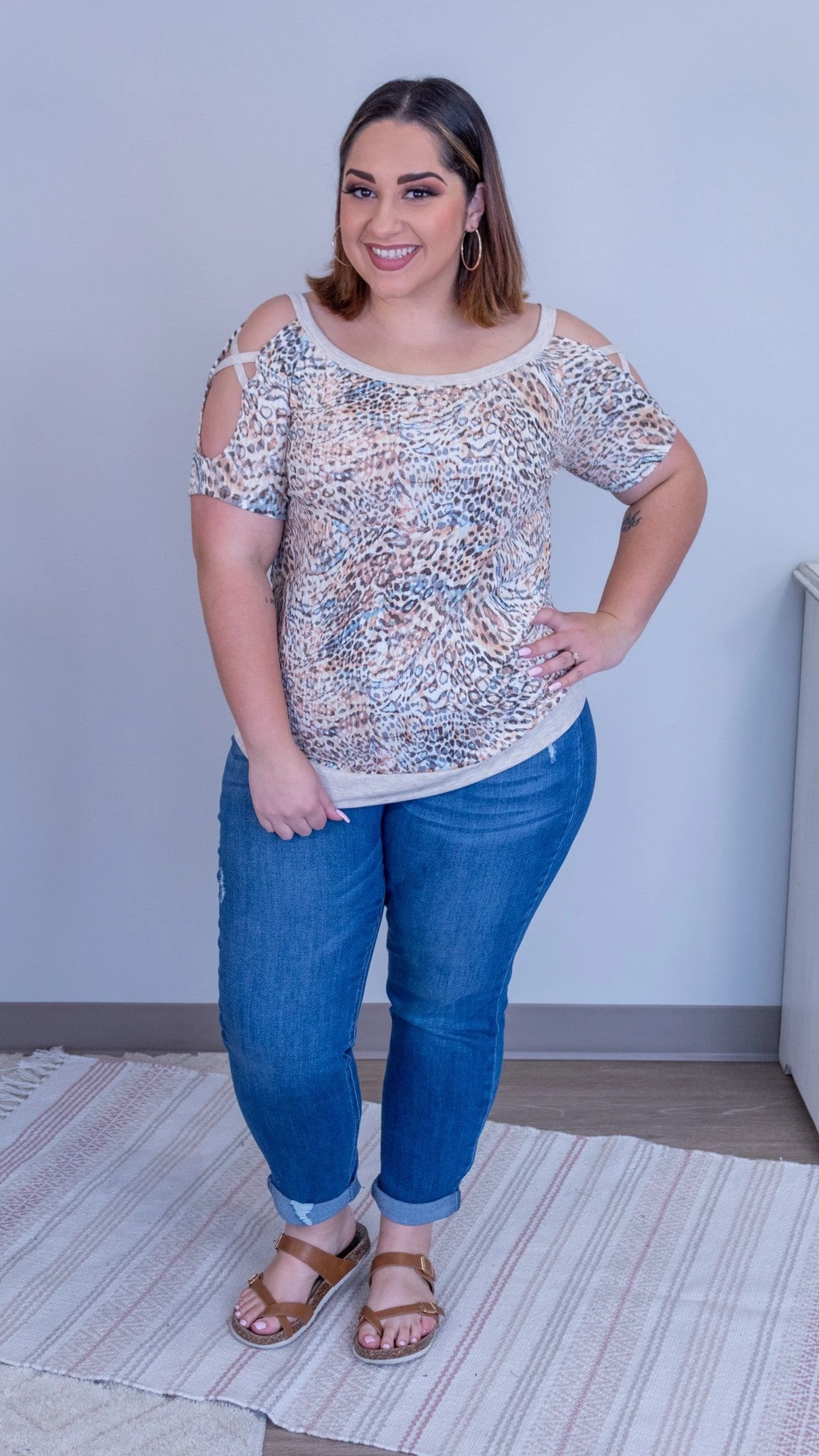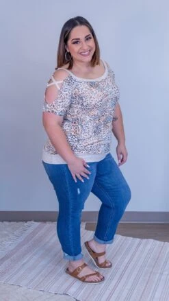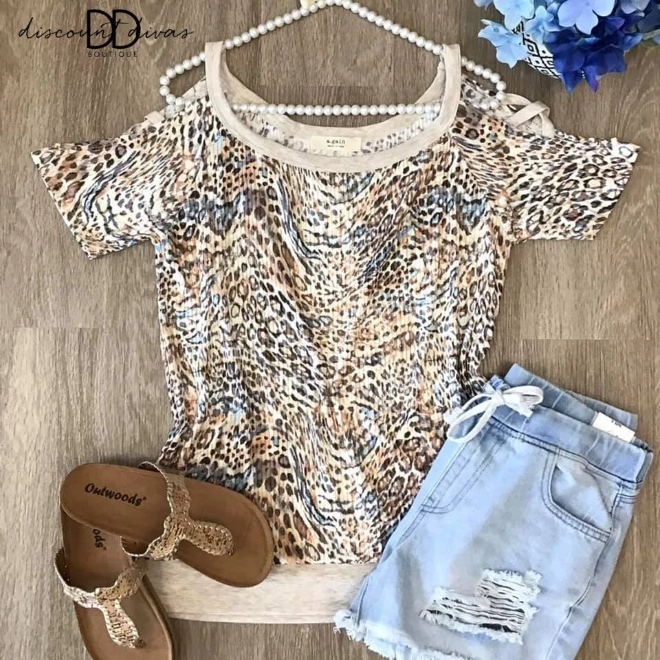 Animal print and cold shoulder, that’s what you get with the Endless Emotions Top!! This sassy little number features a round neck, strappy cold shoulders, and a regular fit bodice. We paired ours with distressed shorts and sandals to complete the look!!