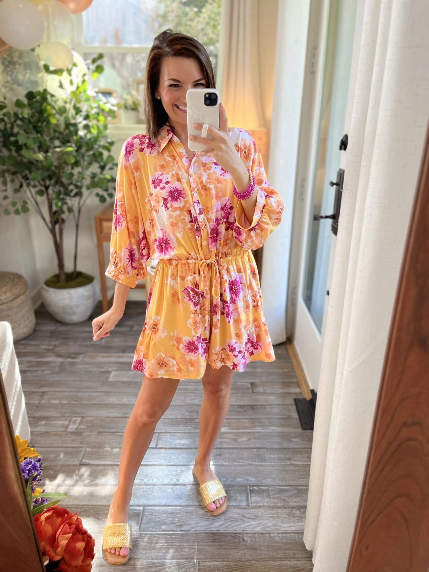 Features: Floral Print, Button Down, 3/4 Sleeves, Drawstring Waist