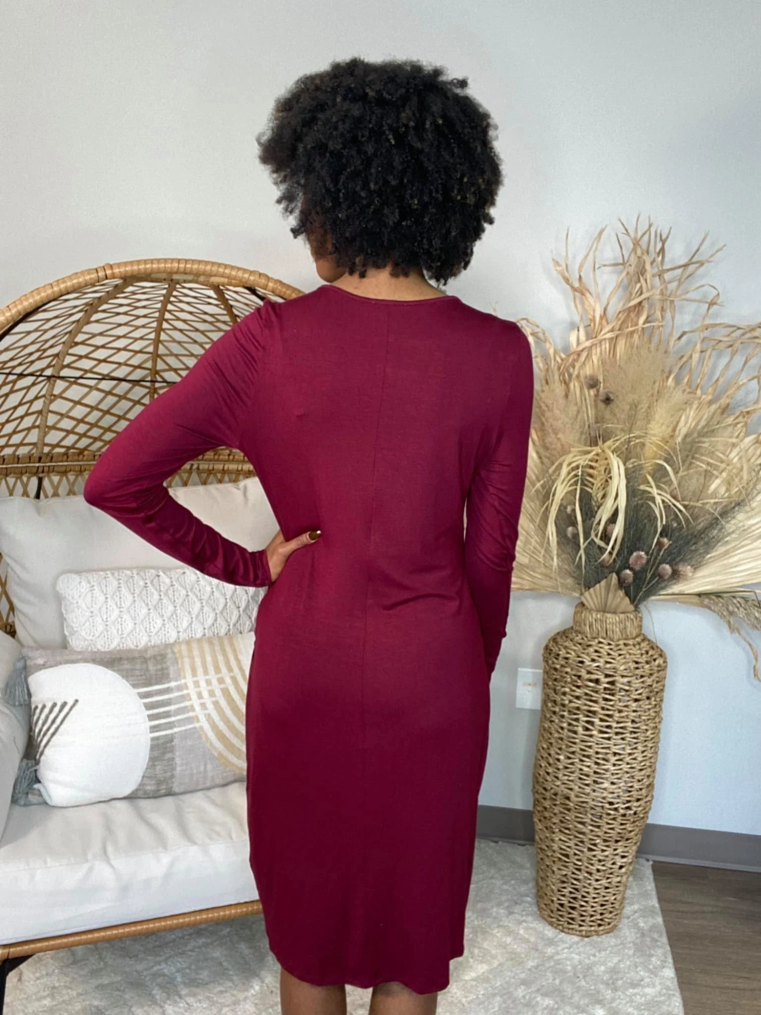 Features: solid print, long sleeve, side knot detail, round neck