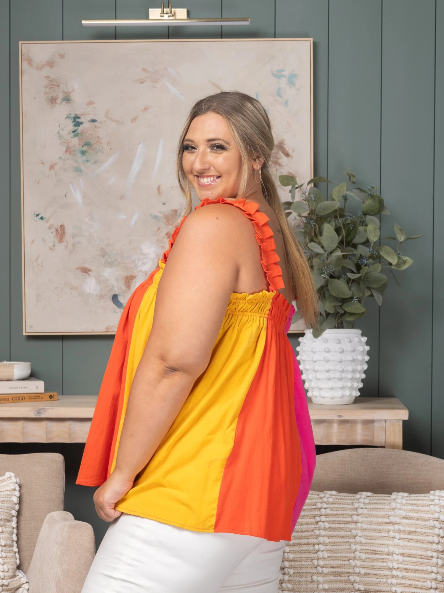 Features: Frill Shoulder Straps, Elastic Opening, Color Block Bodice