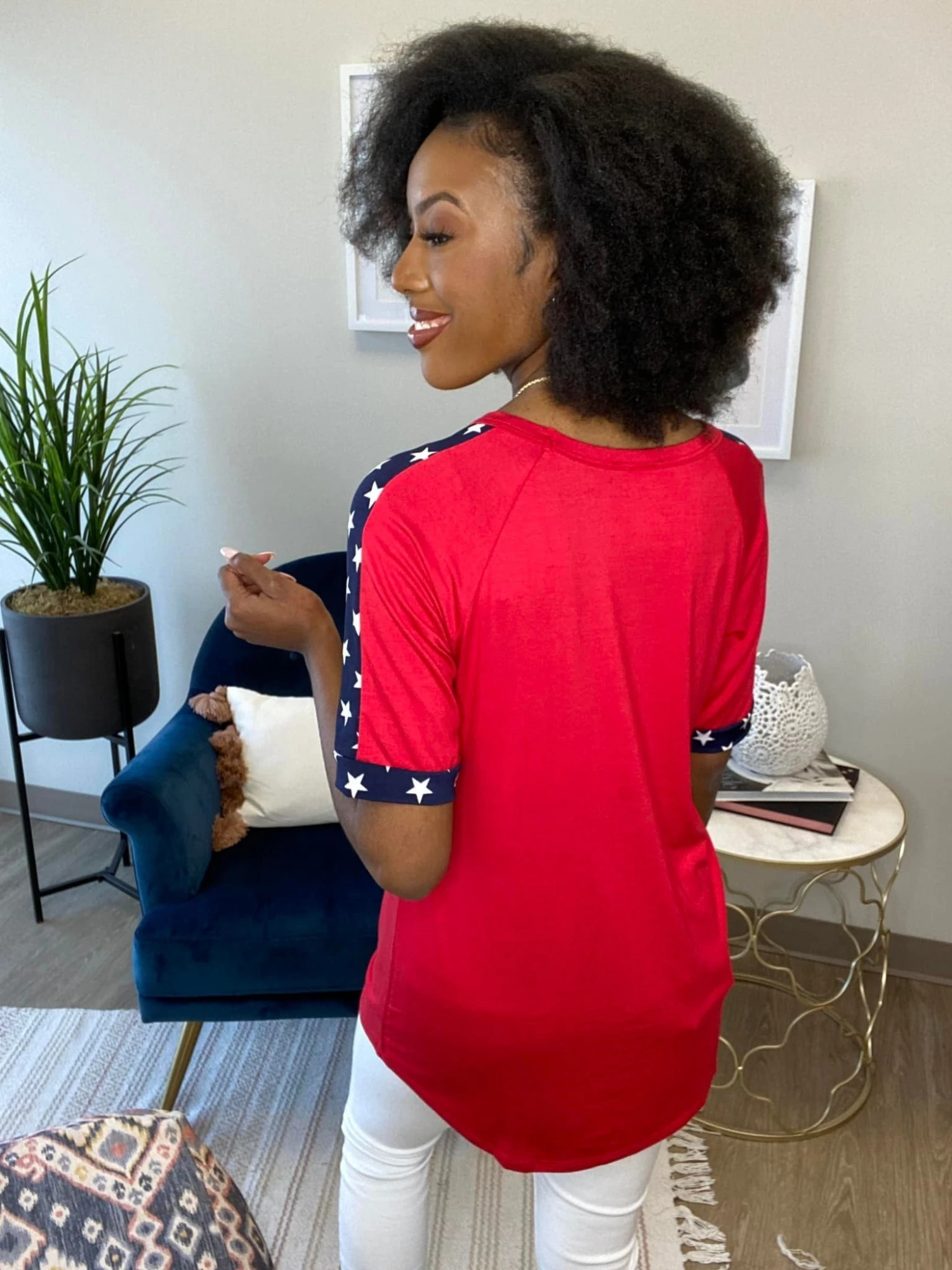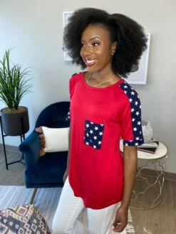 The “From Sea to Shining Sea Top” has arrived! This round neck top is a must have! The beautiful color and star combination is calling your name! Pair with white denim for the perfect look! Snag one before they sell out!