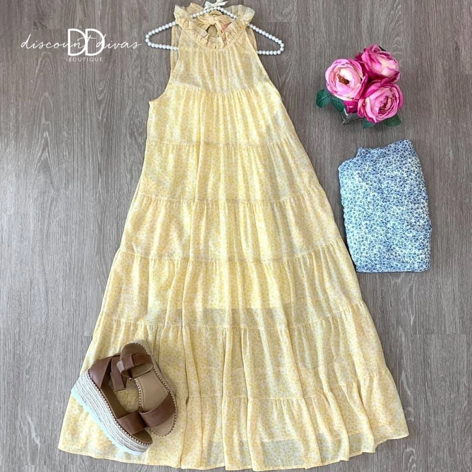 Features: round neck, sleeveless, back tie detail, tiered hem, lined