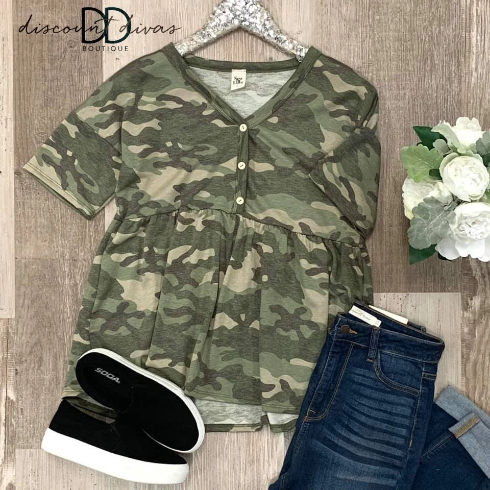No wardrobe is complete without a camo babydoll top!! The Gina Top features a v-neck with summarys, short sleeves, and a babydoll cut. Throw this top on with denim and and slide-on sneakers to complete the look!!