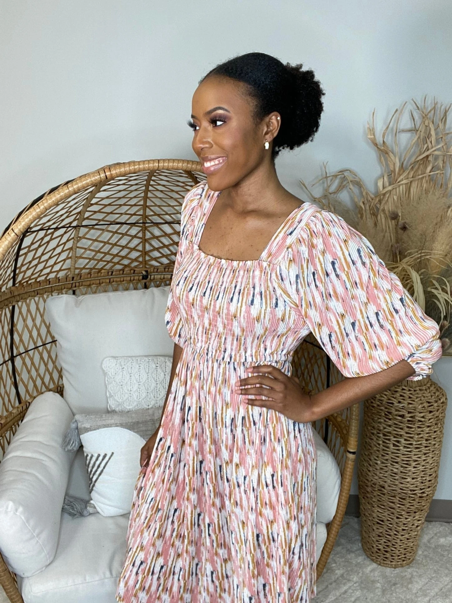 The “Got A Secret Dress” has arrived! This super cute smocked dress belongs in your wardrobe! With the multicolor print and the puff sleeves, you can’t go wrong! Be sure to snag one before they sell out!