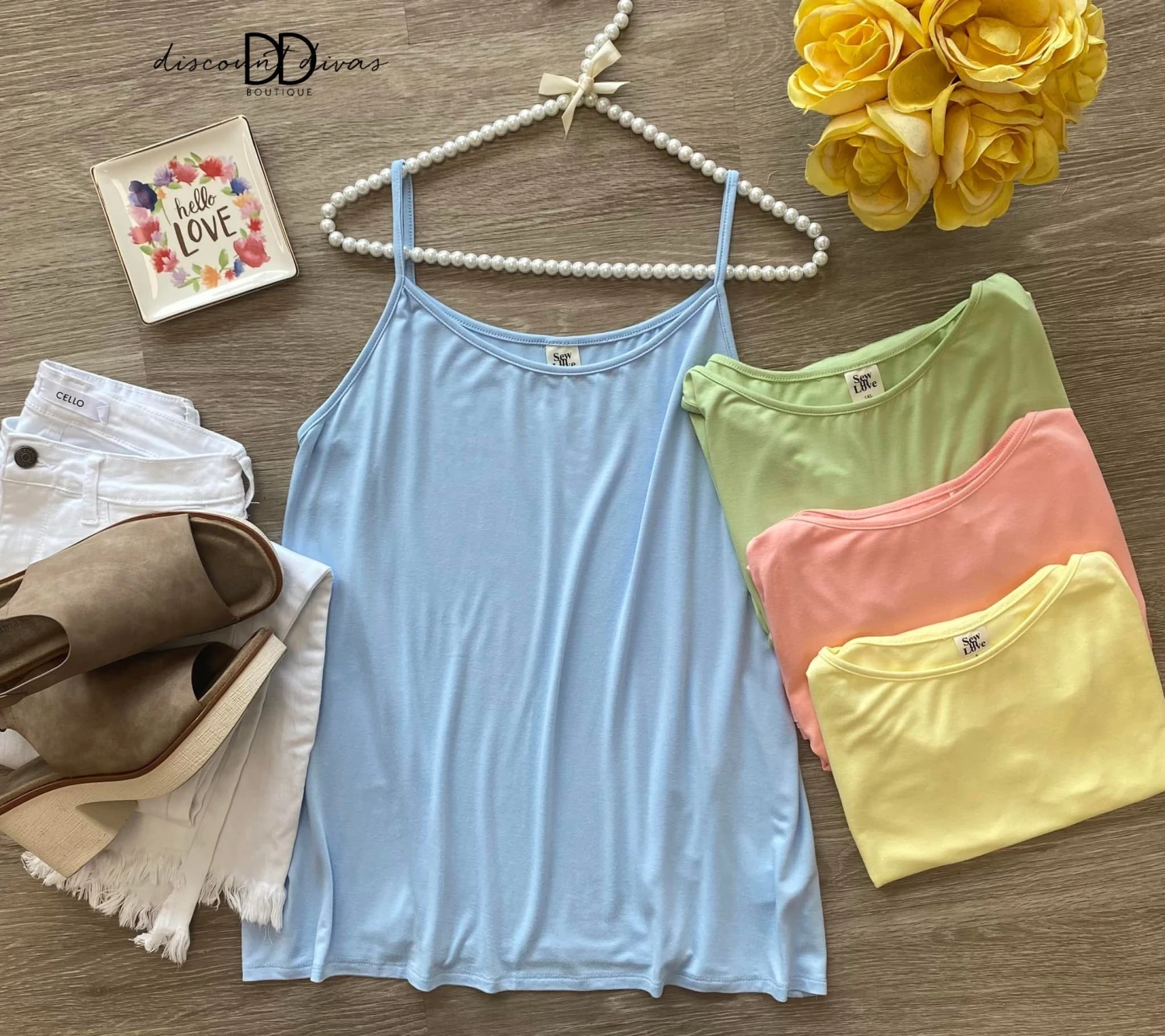 The “Great Recommendations Top” has arrived! This spaghetti strap top is a must have! So simple, yet so stylish, you need this one in your life! The perfect pastel basic, this one is the perfect summer piece! Pair with denim for the perfect look! Snag one before they are gone!