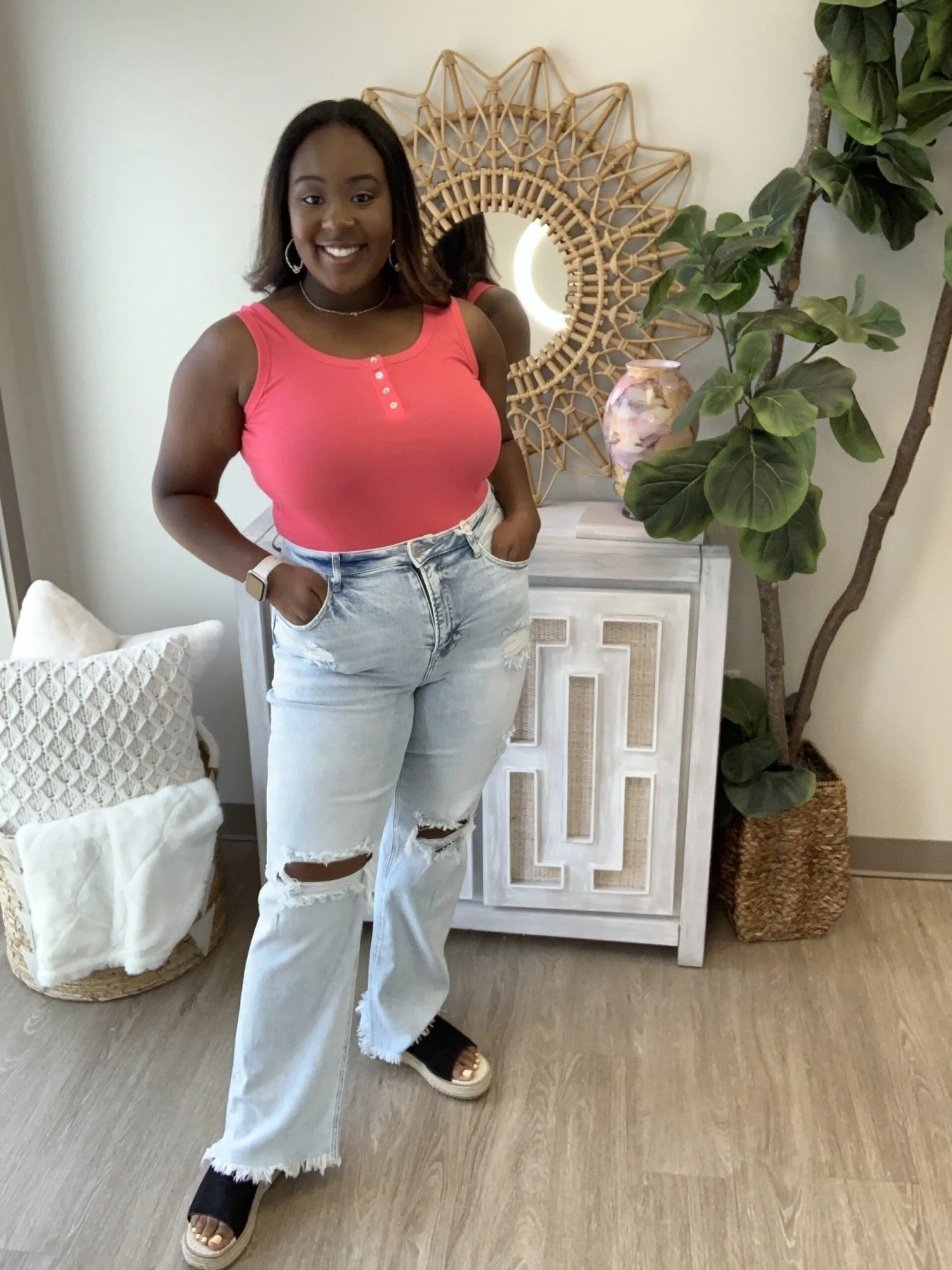 True to size, but definitely a fitted top. If that’s not your thing, you could go up once or twice! These jeans I am wearing are coming soon and OMG! So good!