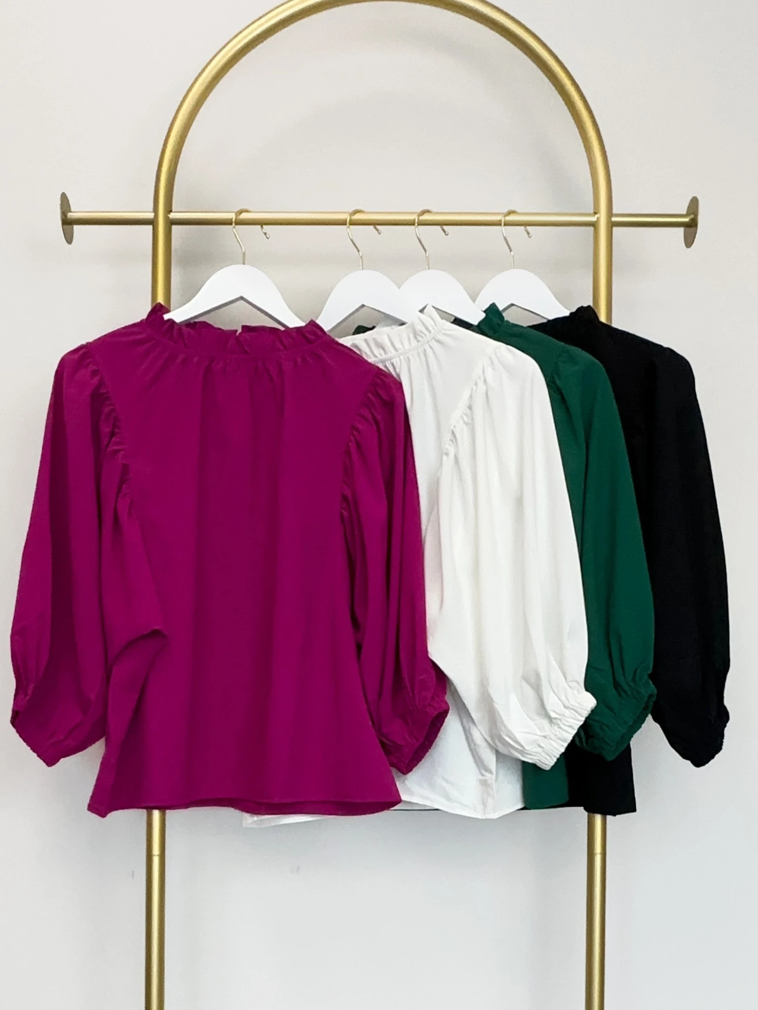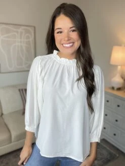 Features: Ruffle, High Neckline, 3/4 Sleeves, Button