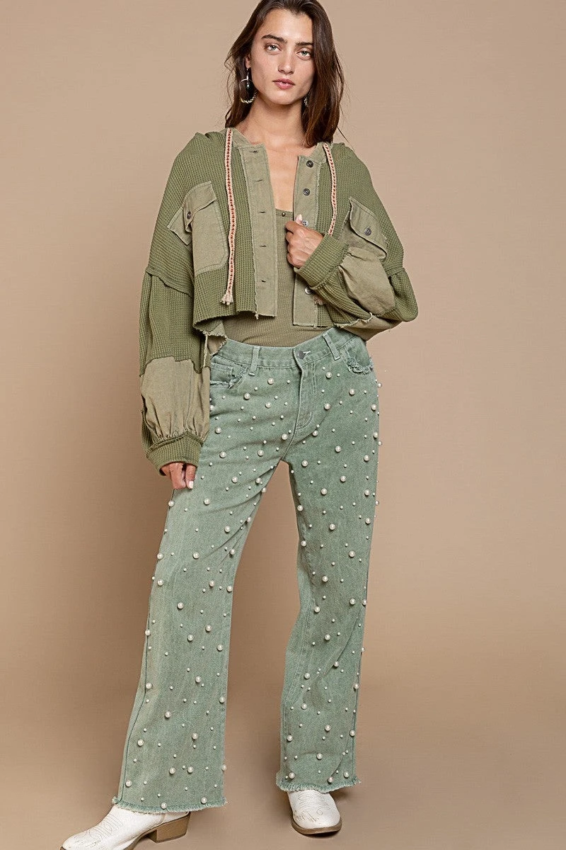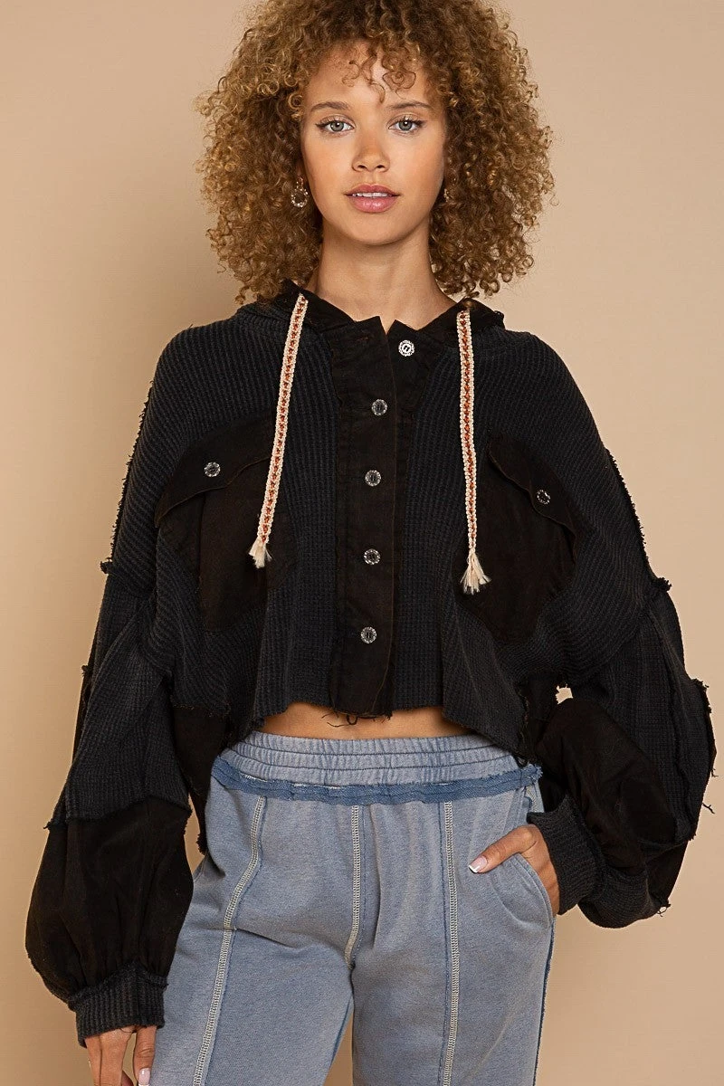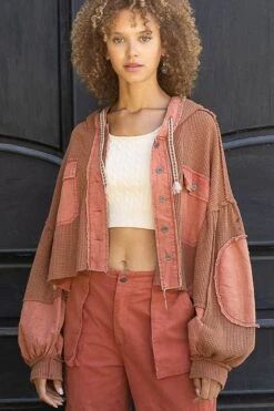 Features: solid print, mineral washed patchwork, long sleeve, cropped, hooded, summary down