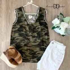Features:Camo print, sleeveless, v-neck, functional front summarys