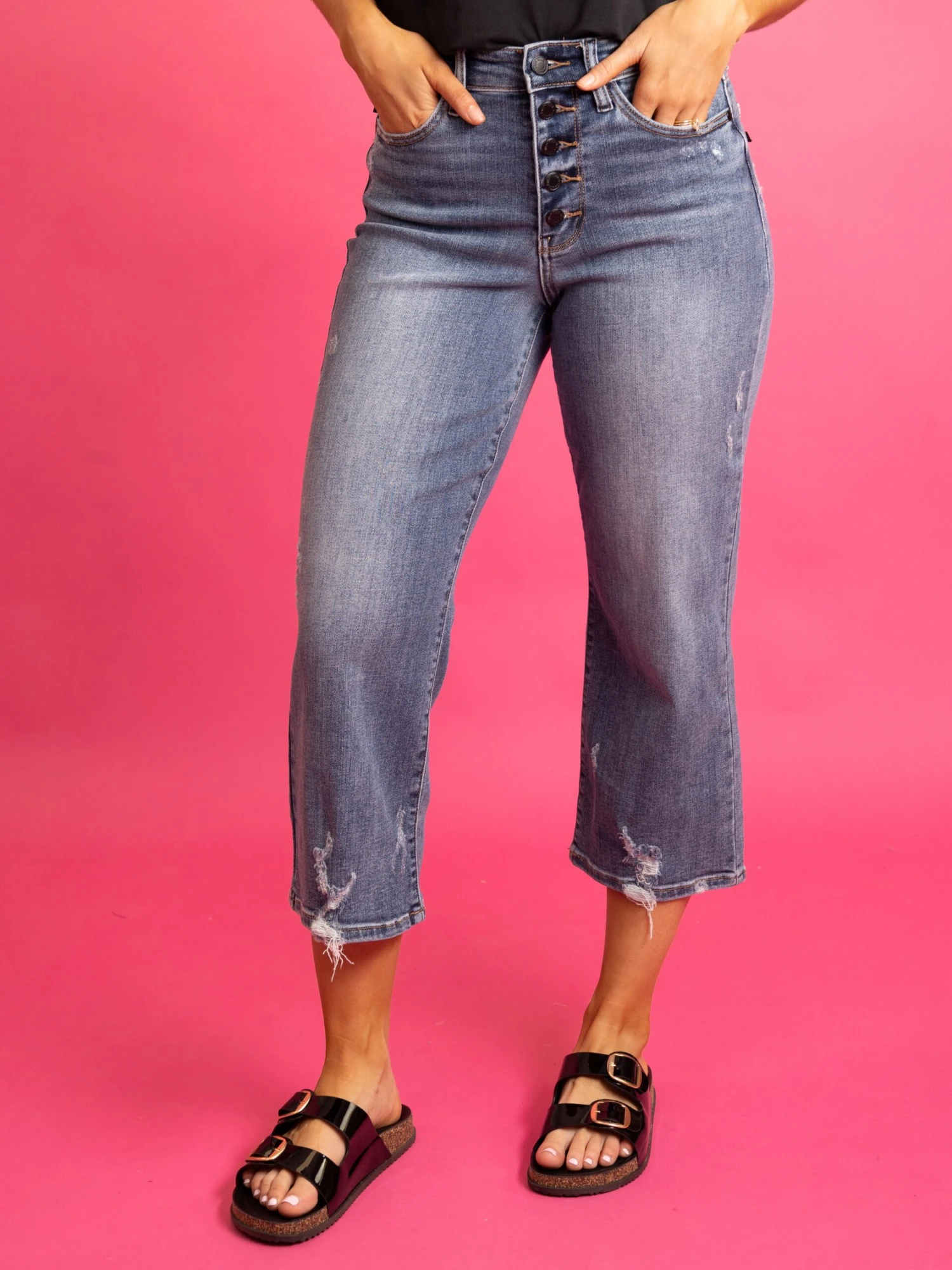 Features: High Waist, Wide Leg, 5 Buttons, Distressed, Cropped