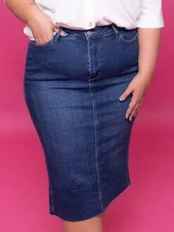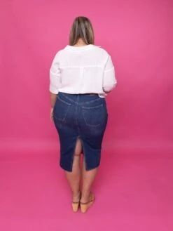Perfect for dressy and casual occasions! This high waist denim skirt hugs you in all the right places, and it has a super cute back slit!