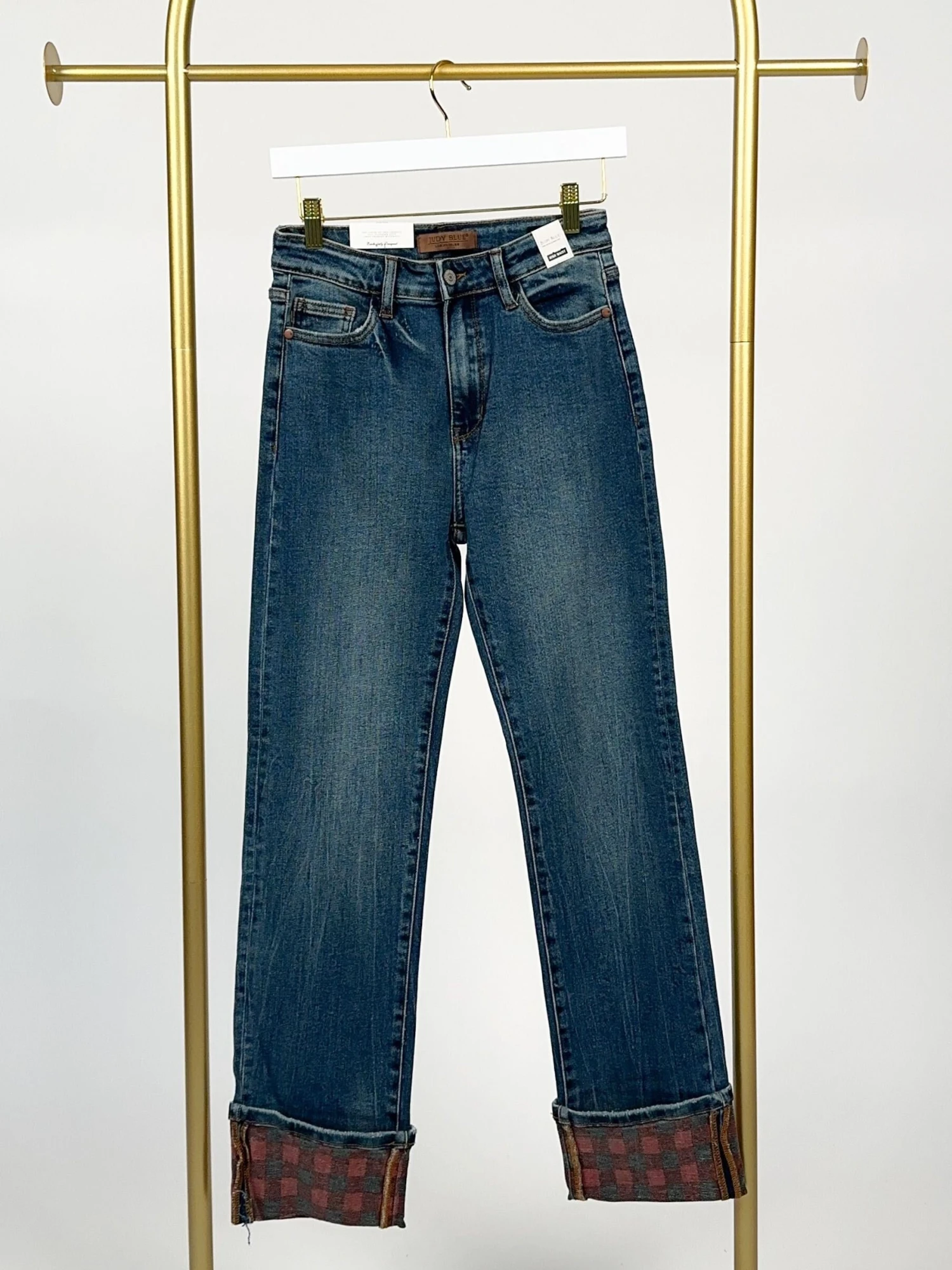 Upgrade your denim collection with these super cute jeans! The plaid cuff is the perfect touch to an amazing pair of stretchy jeans! Hurry and snag!