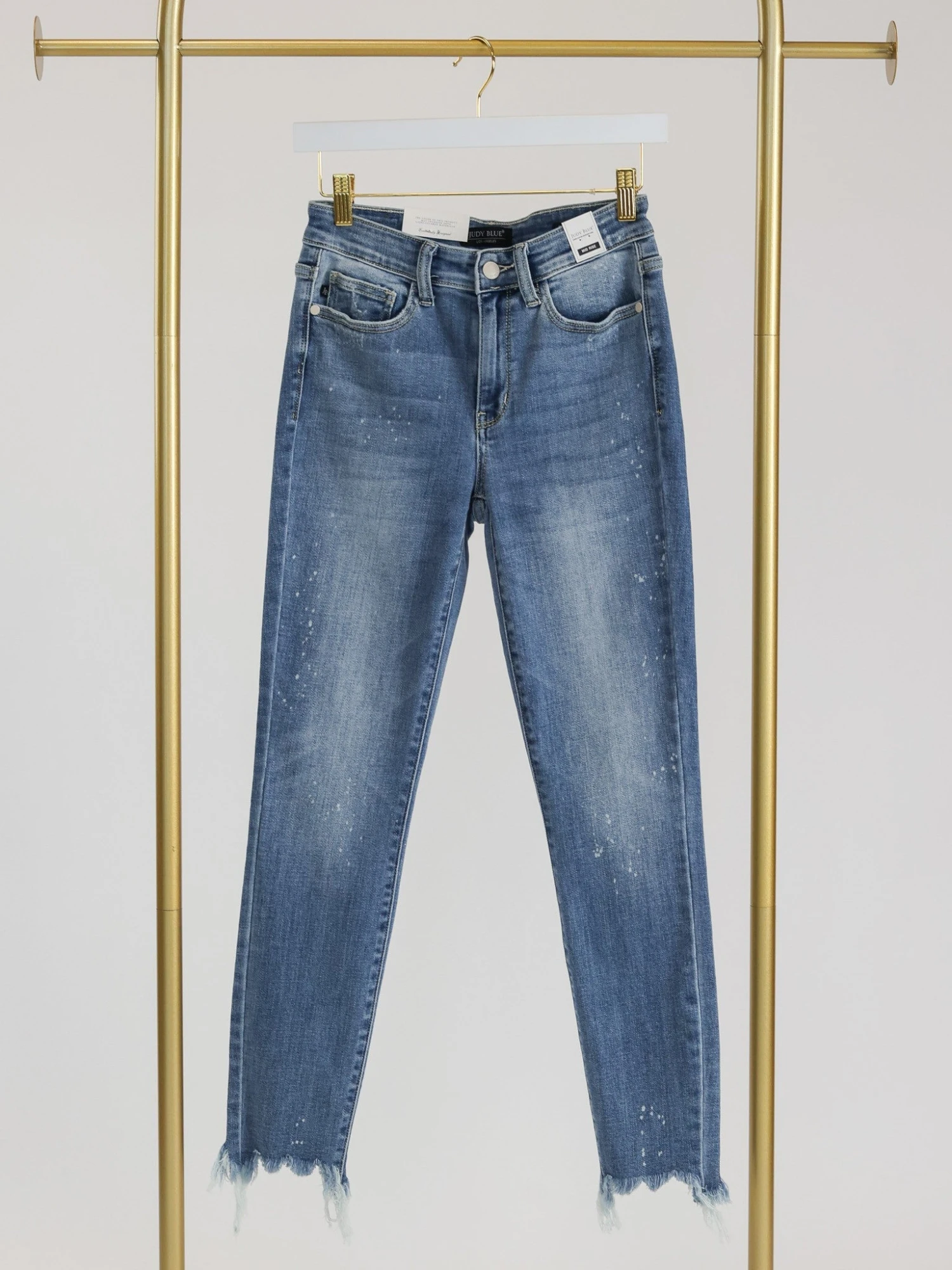Features: Mid Rise, Shark Bite Hem, Skinny