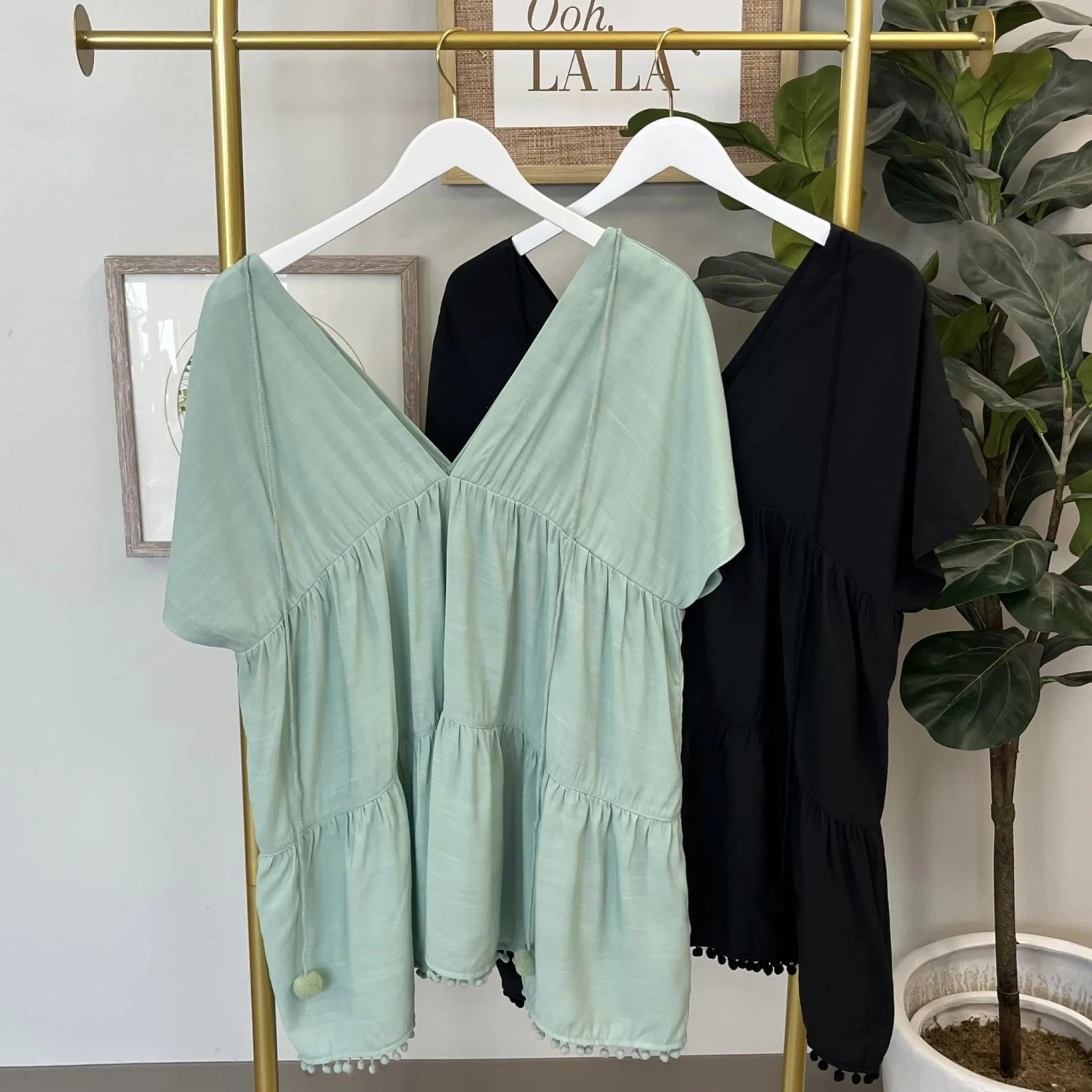 Features: short sleeved, pom-pom, tiered, v-neck