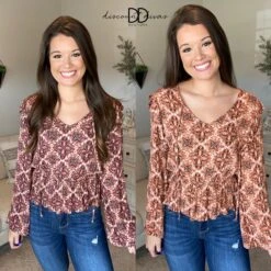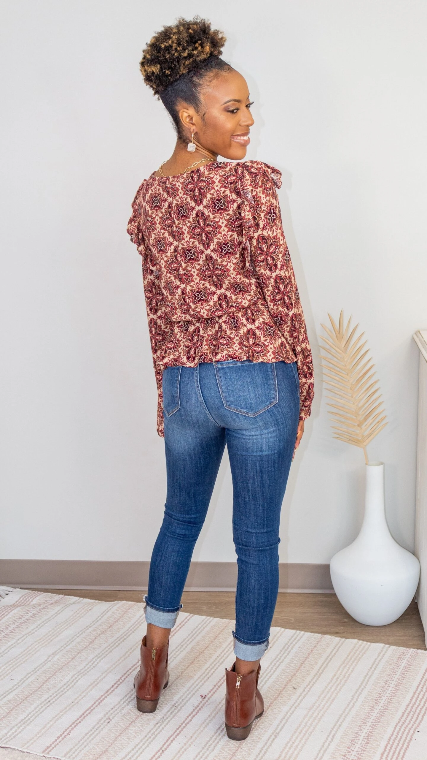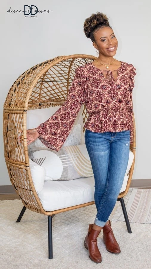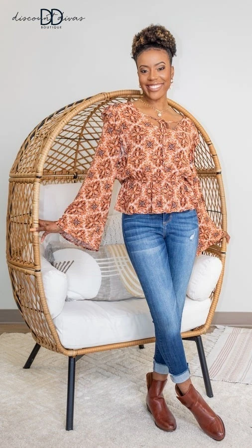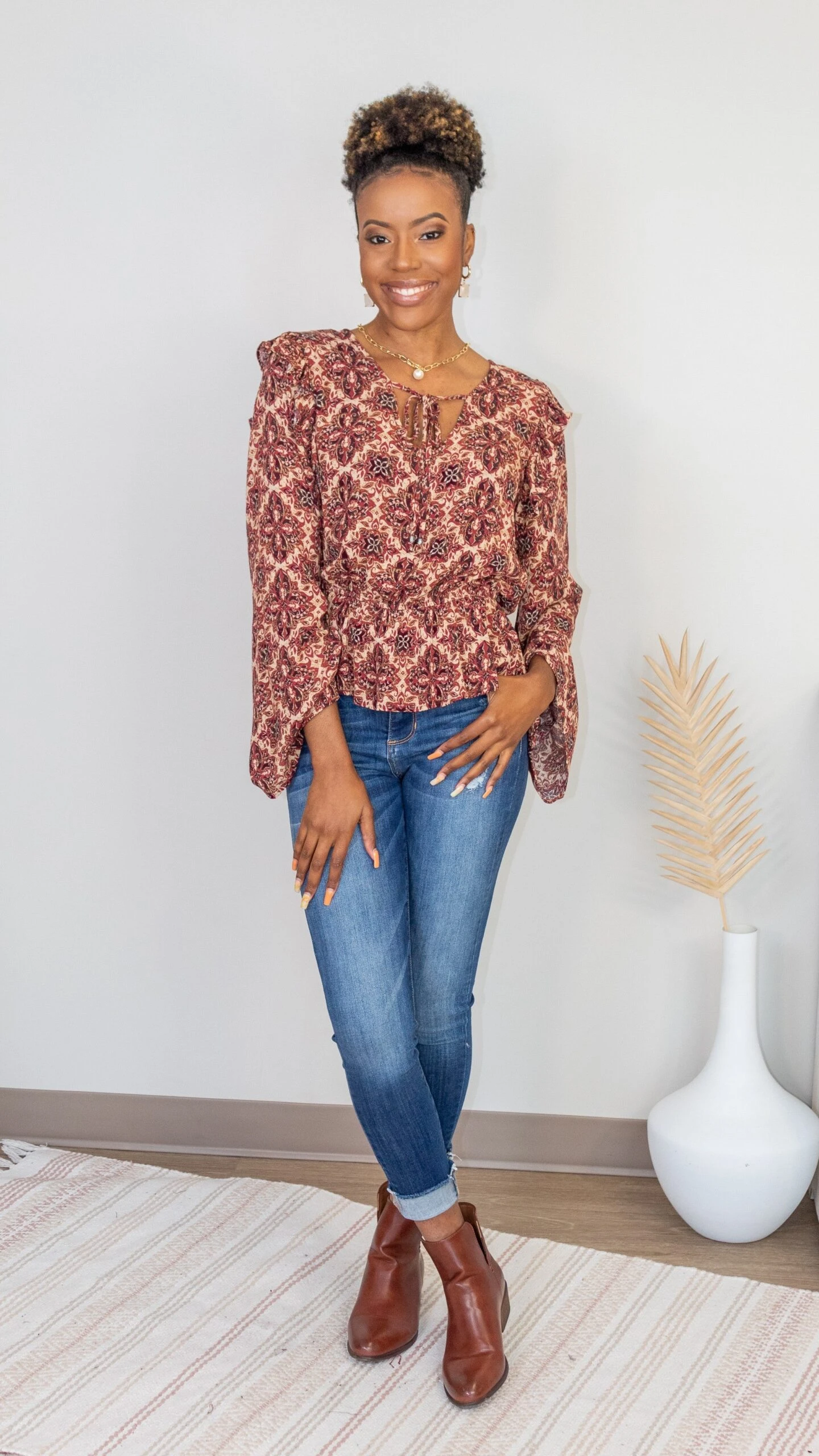 The Know Yourself Top is so unique and fun! The print on this one is gorgeous and it features a bell sleeve and cinched waist! Perfect to pair with your favorite flairs!