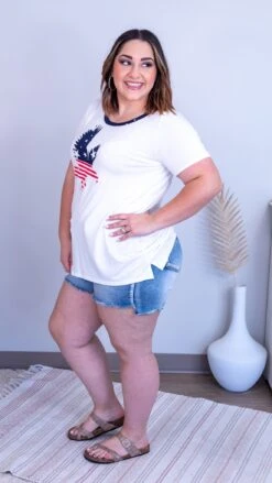 Hey Girls!! The Land Of The Free Top is for all the American girls out there!! This short sleeve top features a stars and stripes eagle on the front. The gorgeous collar is detailed with stars. Grab this tee for all of your summer activities!!
