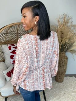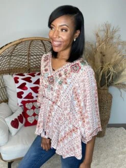 The “Living In The Present Top” has arrived! This v-neck top is a must have! With pleat details and an embroidered front, the details on this are endless! Pairs perfectly with denim and booties, you cannot go wrong!