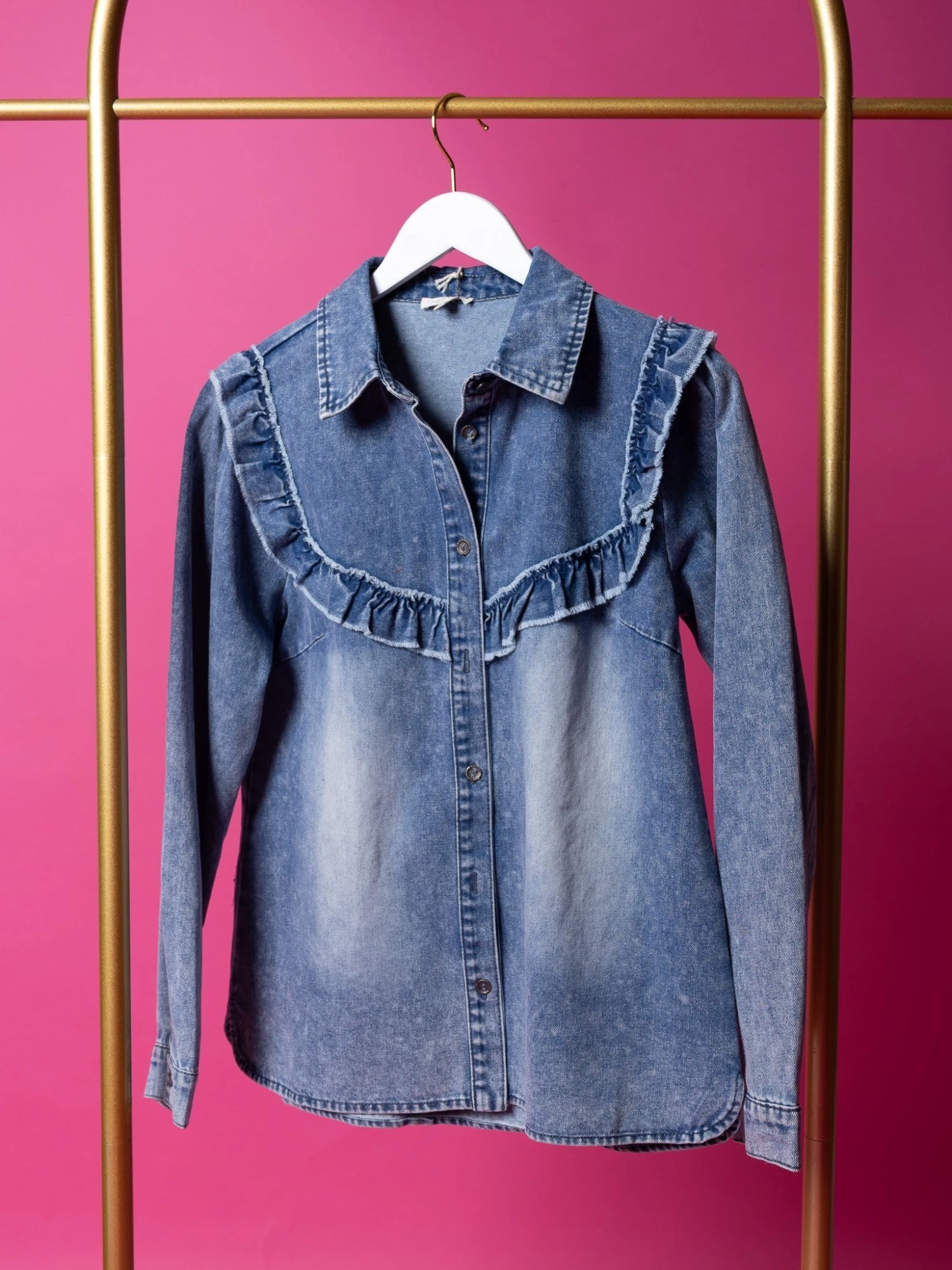 The summary-down design adds a classic touch, while the frilled yoke creates such a romantic vibe! Pair it with jeans for a cute denim on denim look!