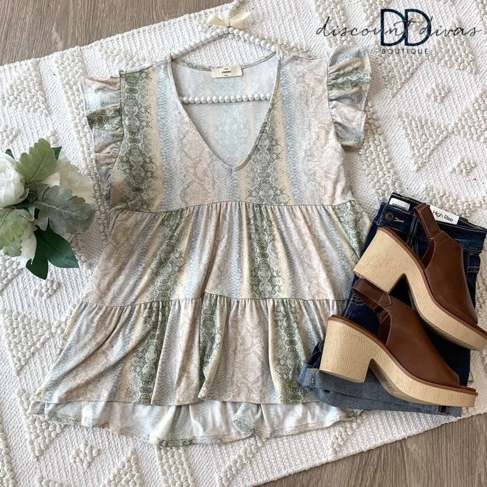 This short sleeve babydoll top is not one you want to sleep on! Such a cute pattern, v-neck, a ruffled sleeve and a tiered hem. Make sure you snag it before it’s sold out!