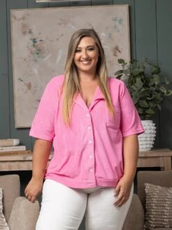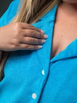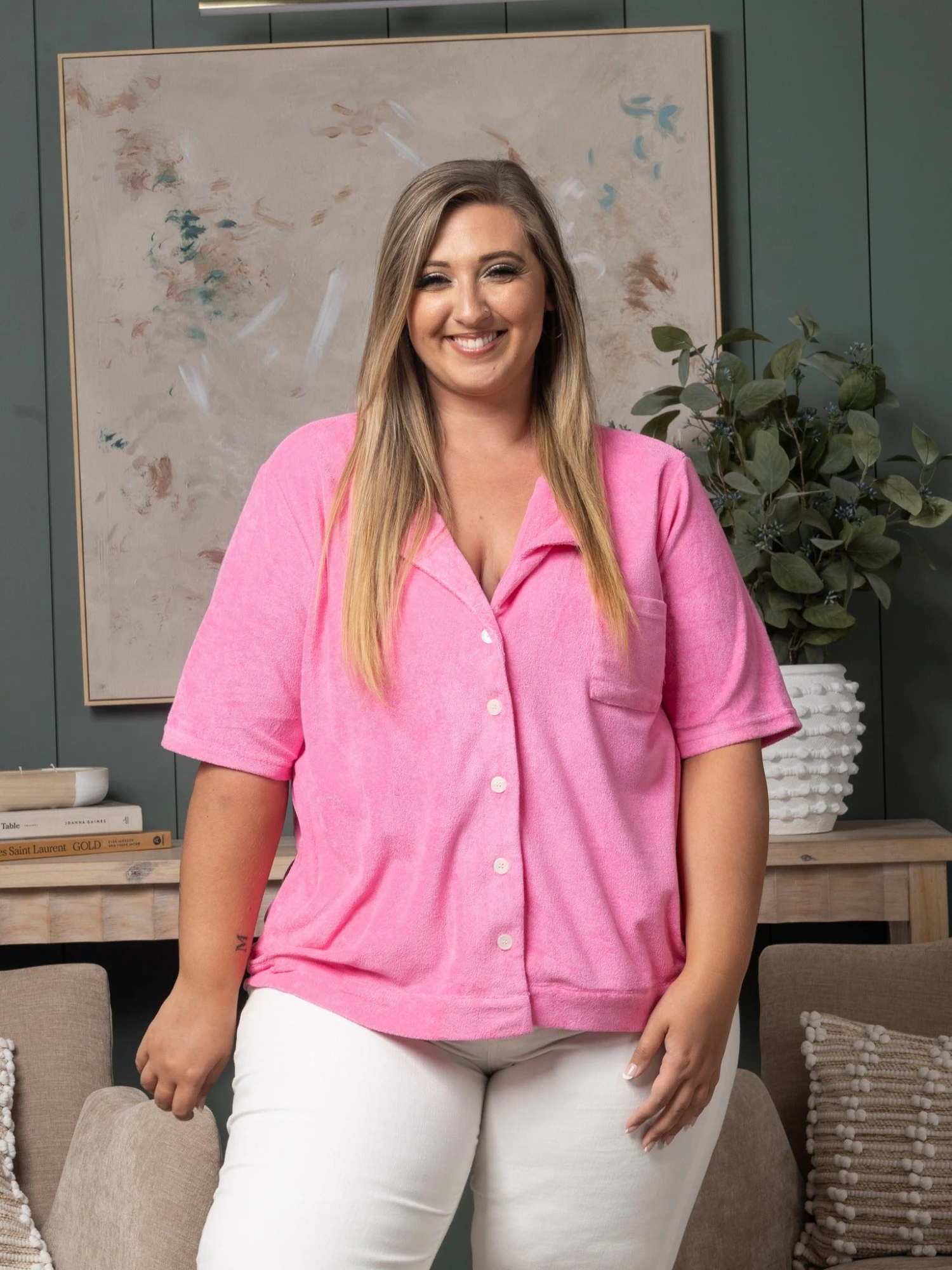 Features: Towel Texture, Terry Button Down, Collared Neck