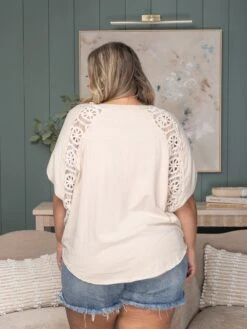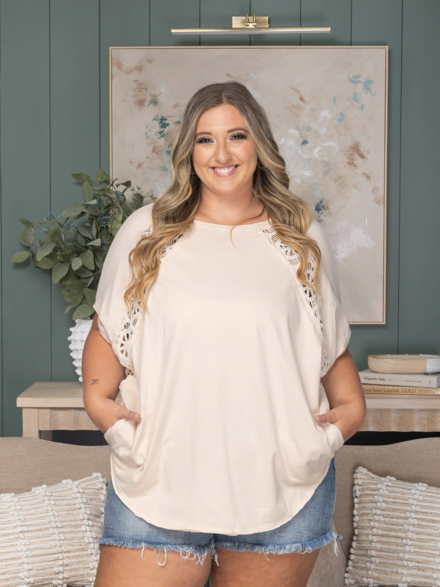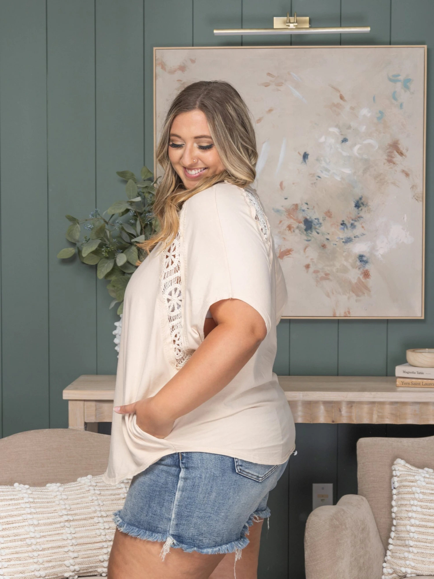 Features:Round Neck,Short Sleeve with Lace Detail,Solid Round Hem
