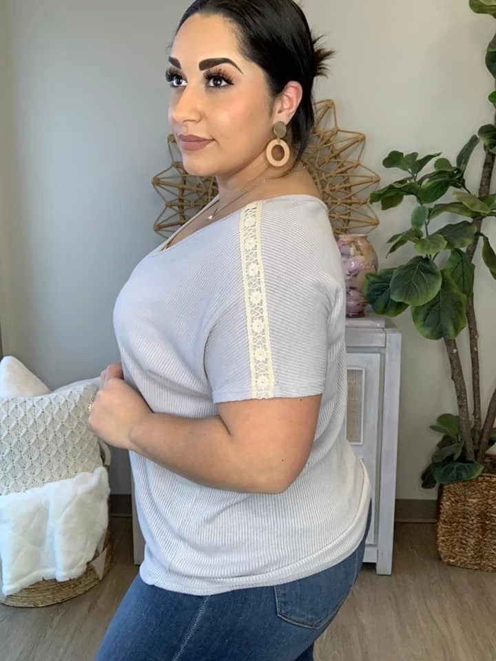 The “Morning Light Top” has arrived! This v-neck top is a must have! With lace shoulder details, you cannot go wrong! Perfect for warmer weather, snag this one for spring and summer! You cannot go wrong here!