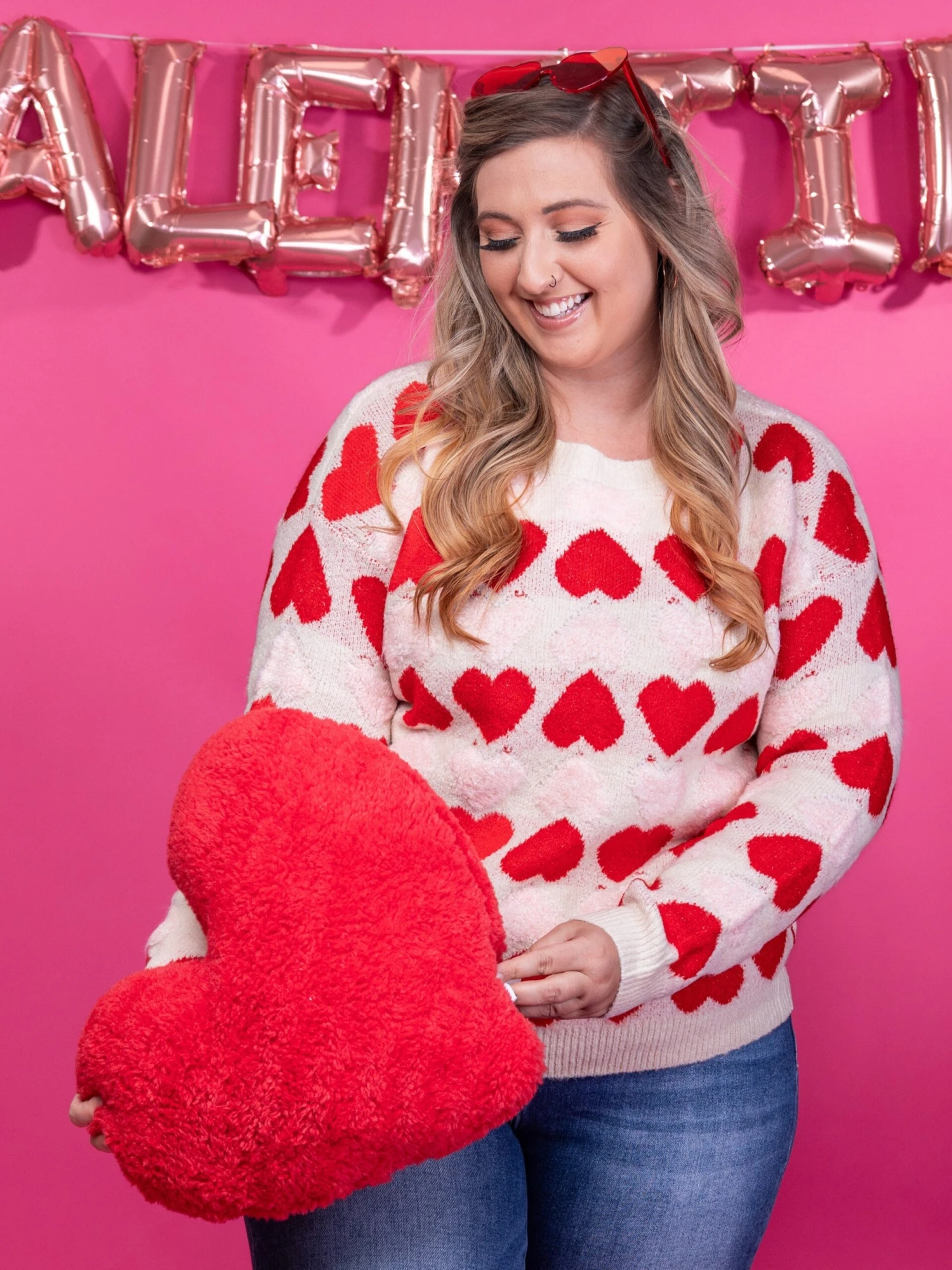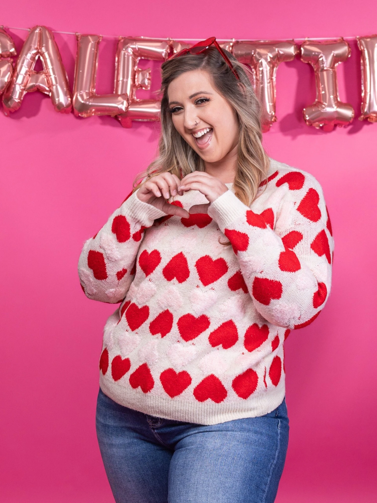 Embrace the season with this cozy heart print sweater! This is the prefect look to dress up or down! Wear your heart on your sleeve and brighten up your winter wardrobe by snagging today!