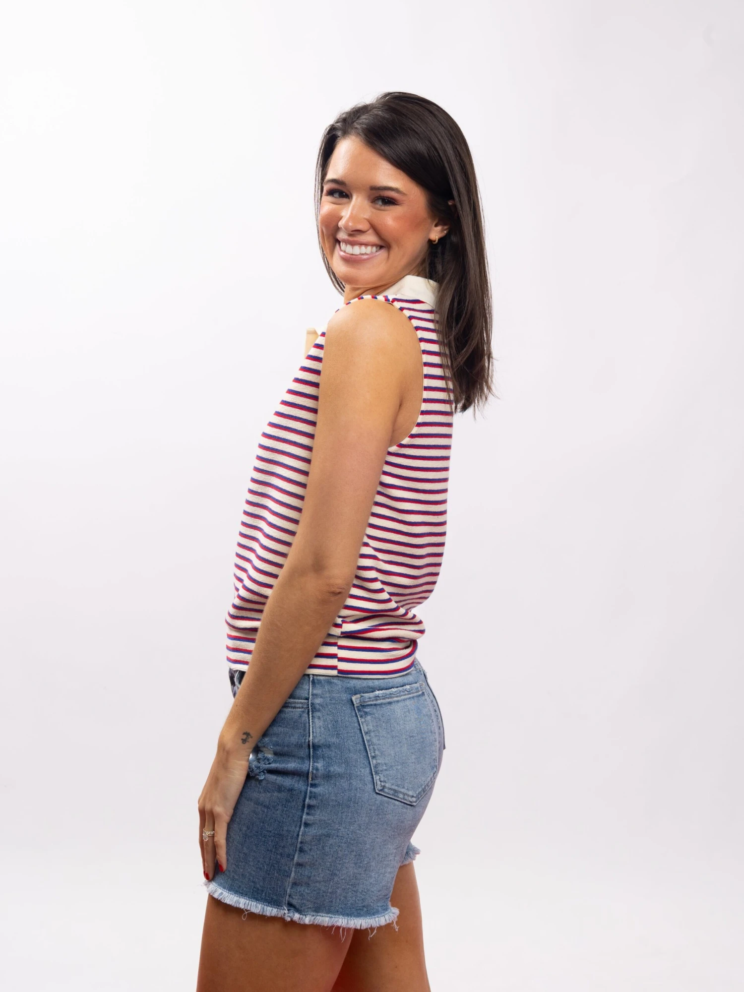 Features: Split Neck with Collar, Sleeveless, Striped