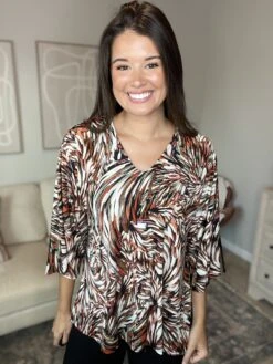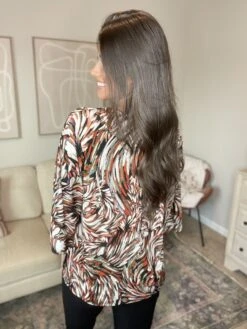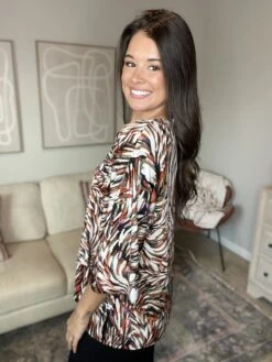 We are loving the fun print on this top! Pair it with your favorite jeans or a nice pair of dress pants and you are ready to go!