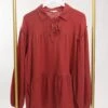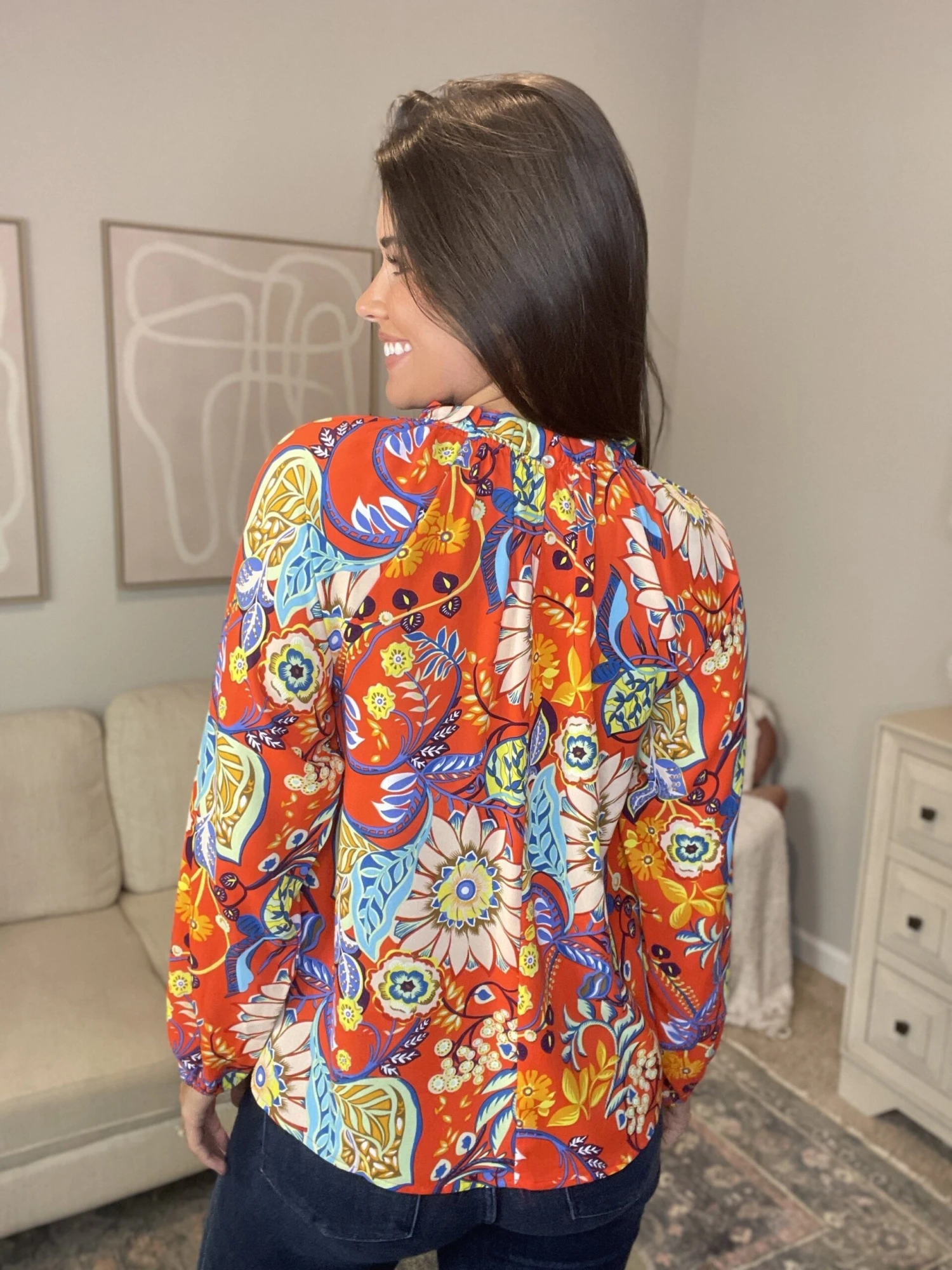 Features: paisley print, long bubble sleeves, round ruffled neck