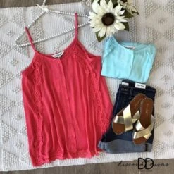 Features: lace detail, sleeveless, adjustable spaghetti straps, summary down