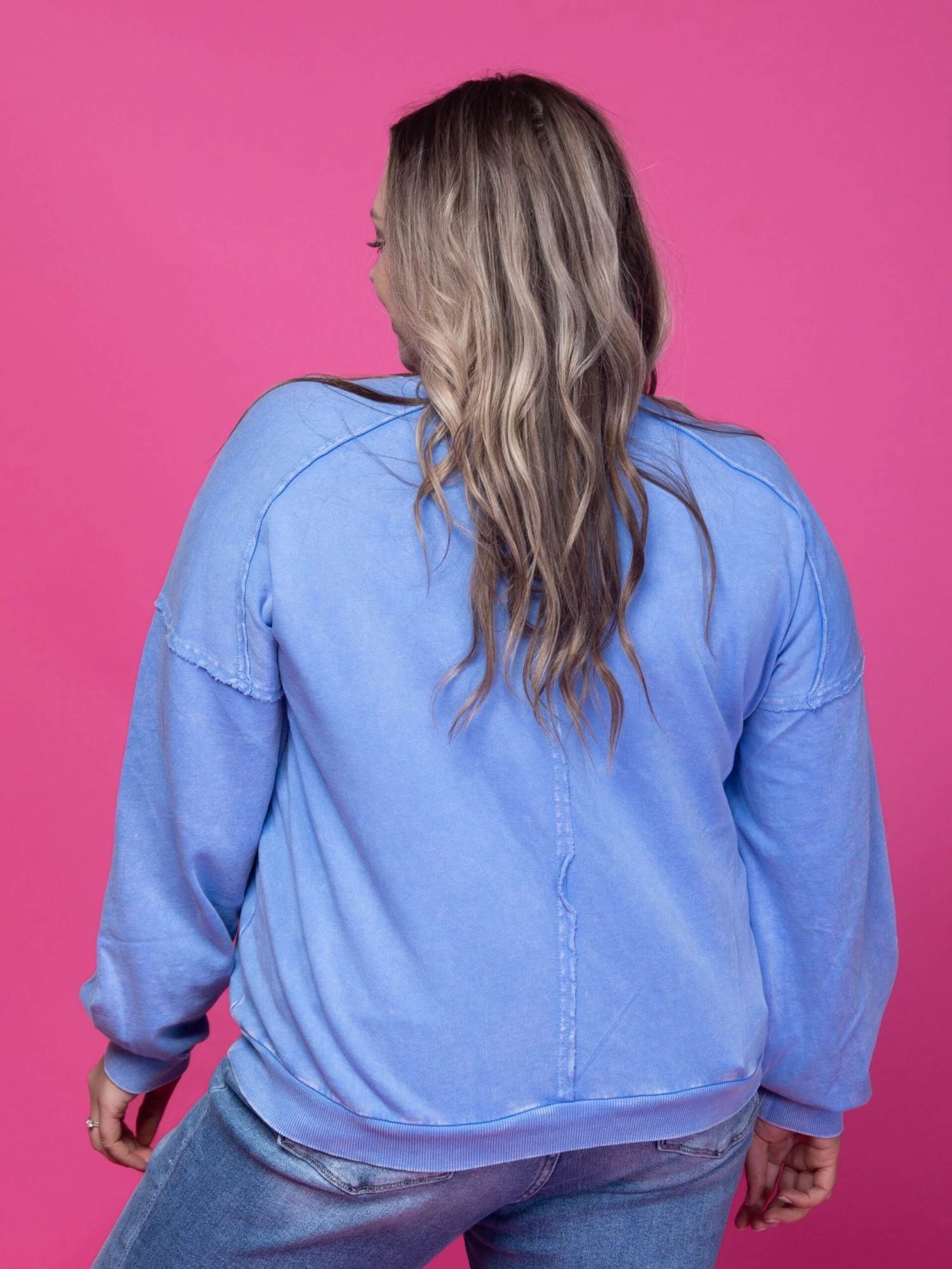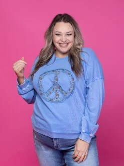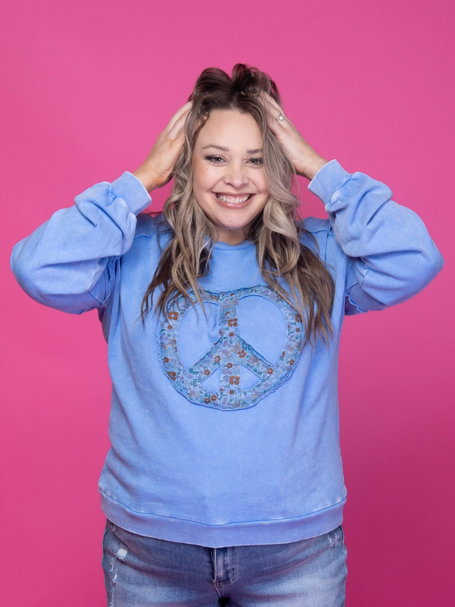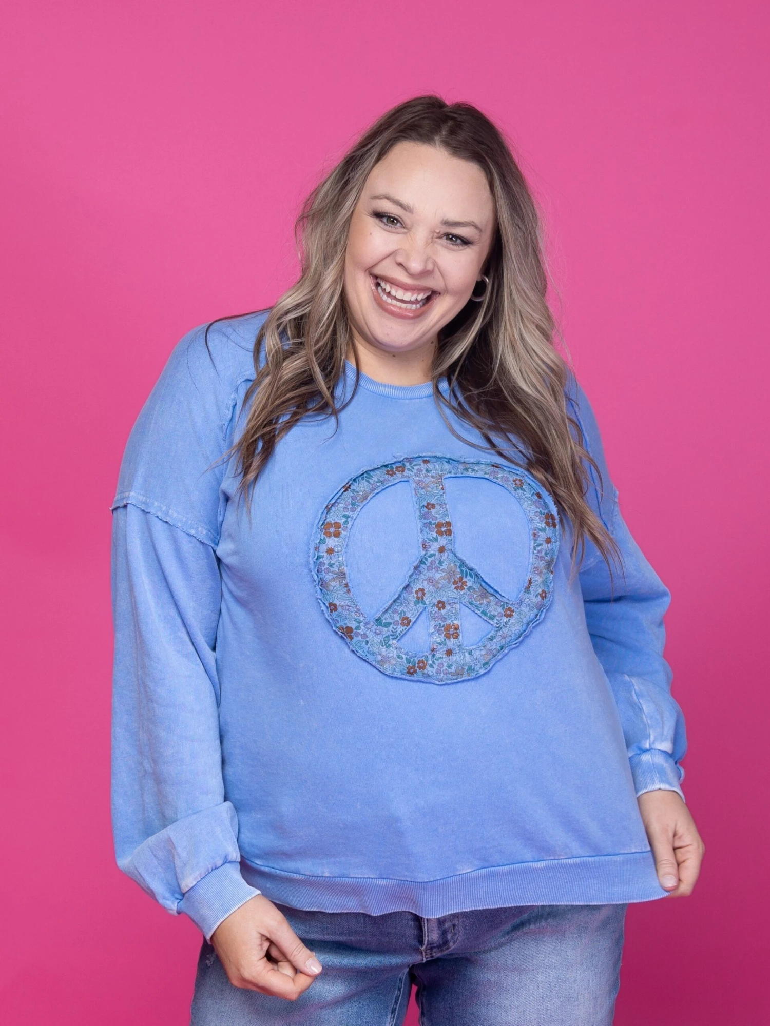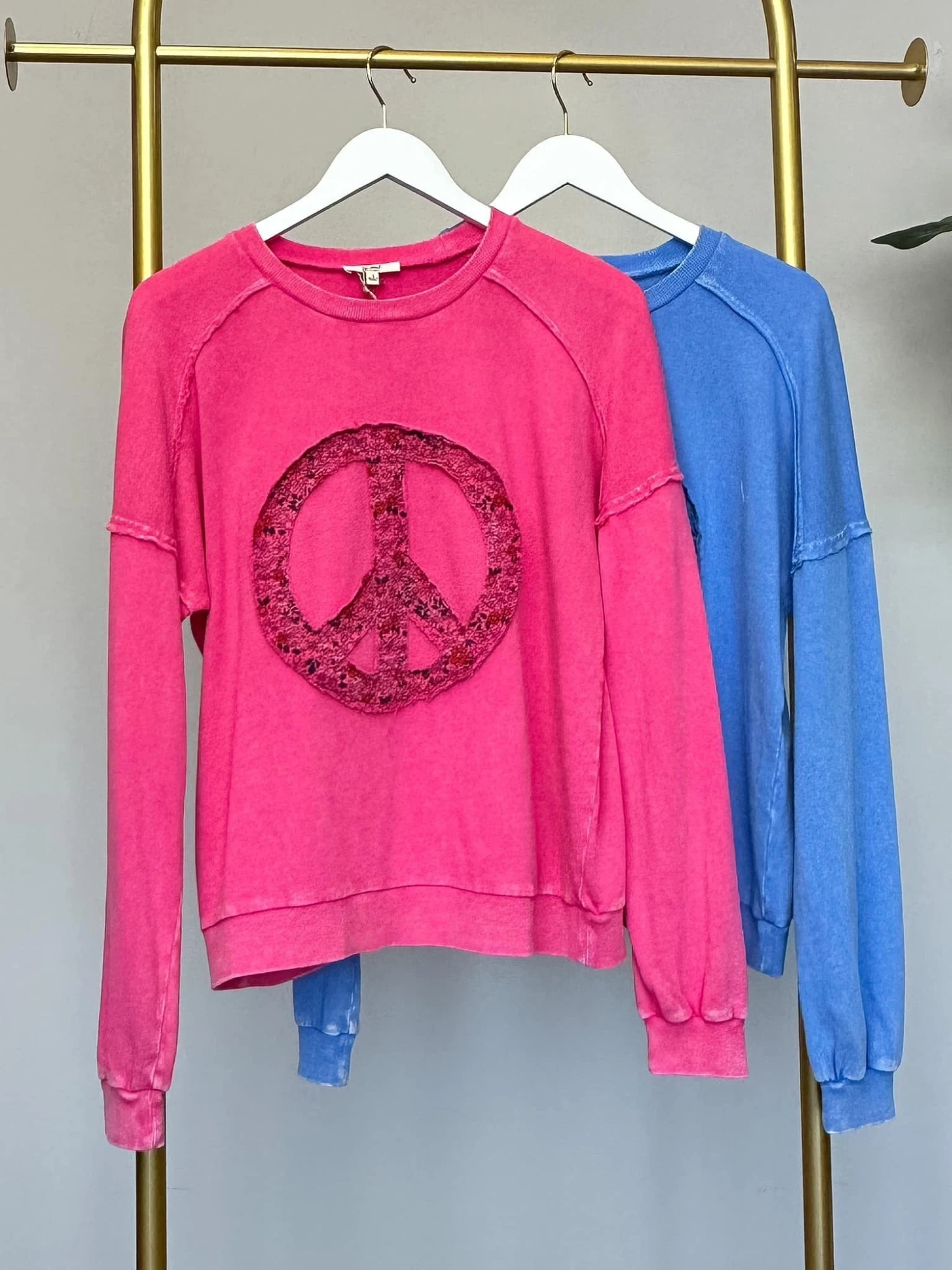 Features: washed solid print, floral peace sign patch, round neck, long sleeve