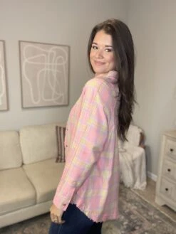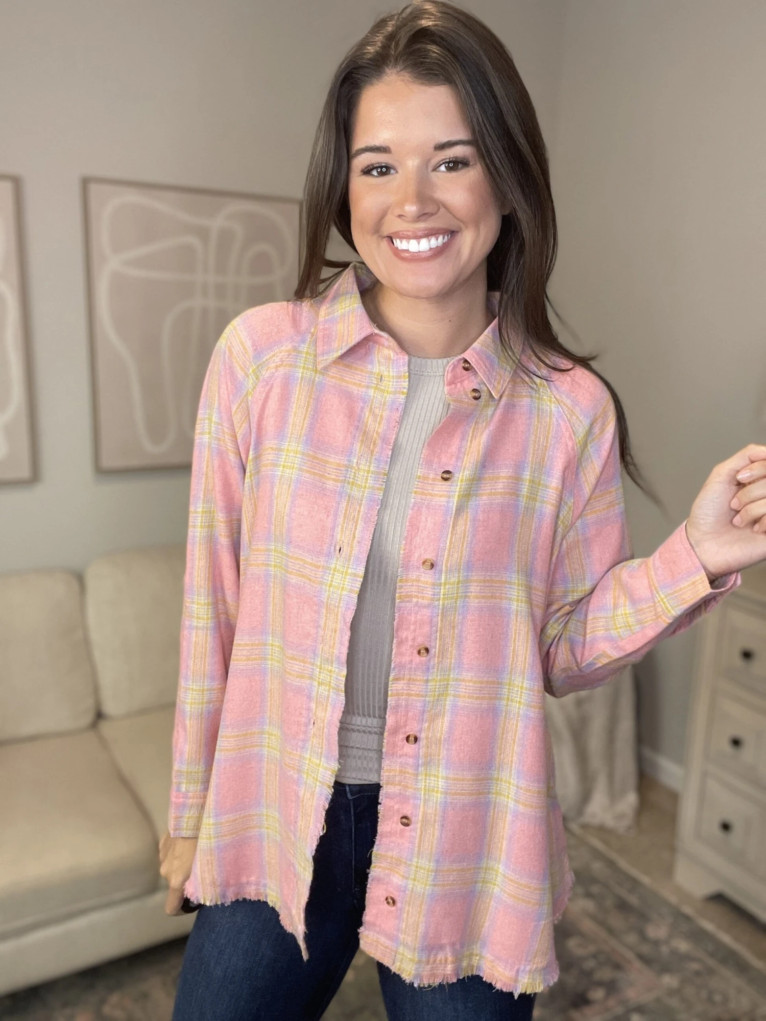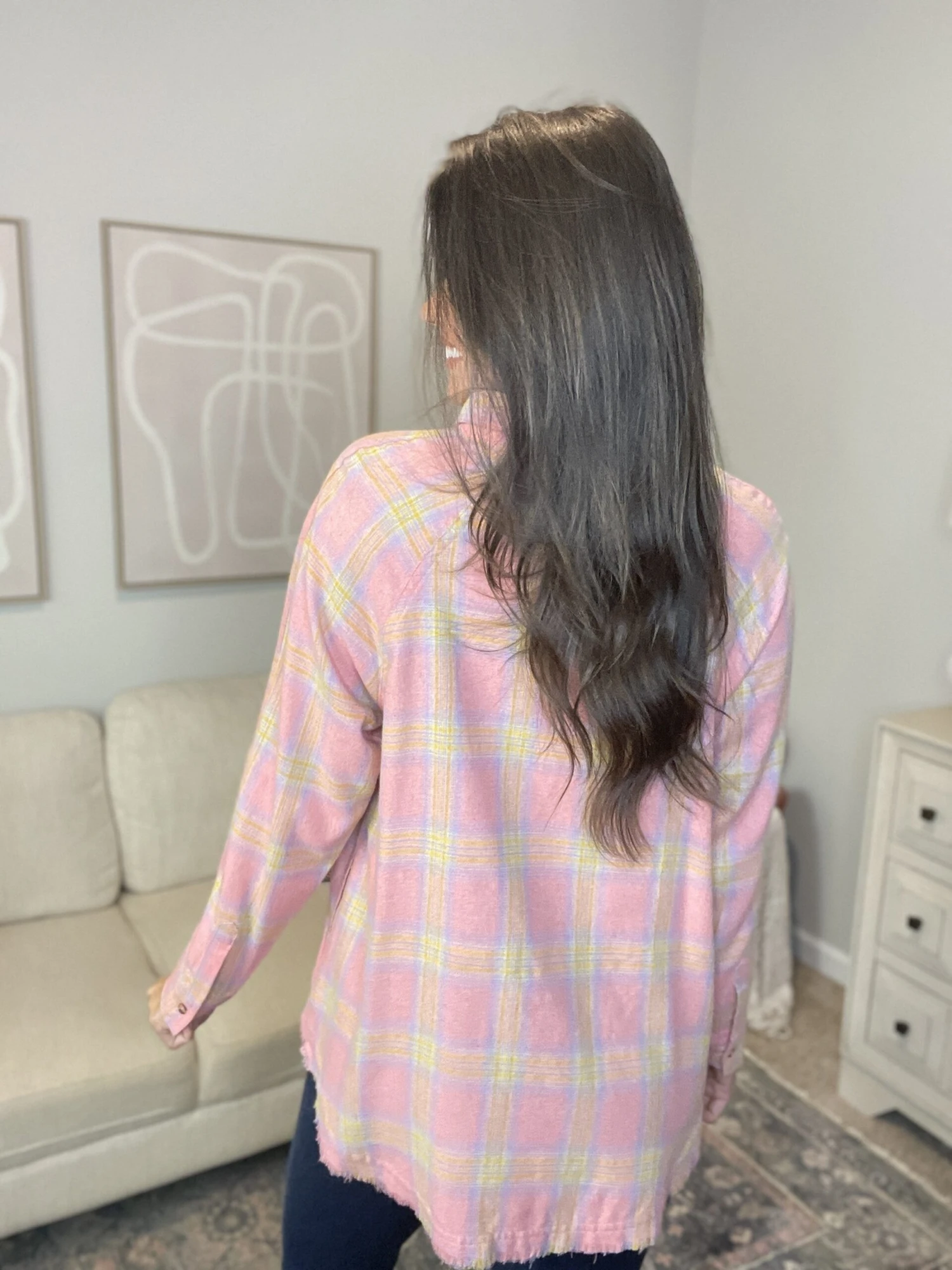 Features: plaid print, summary down, raw hem, collared, long sleeve