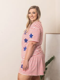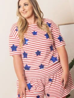 Features: Sequin, Horizontal Stripe Print, Round Neck