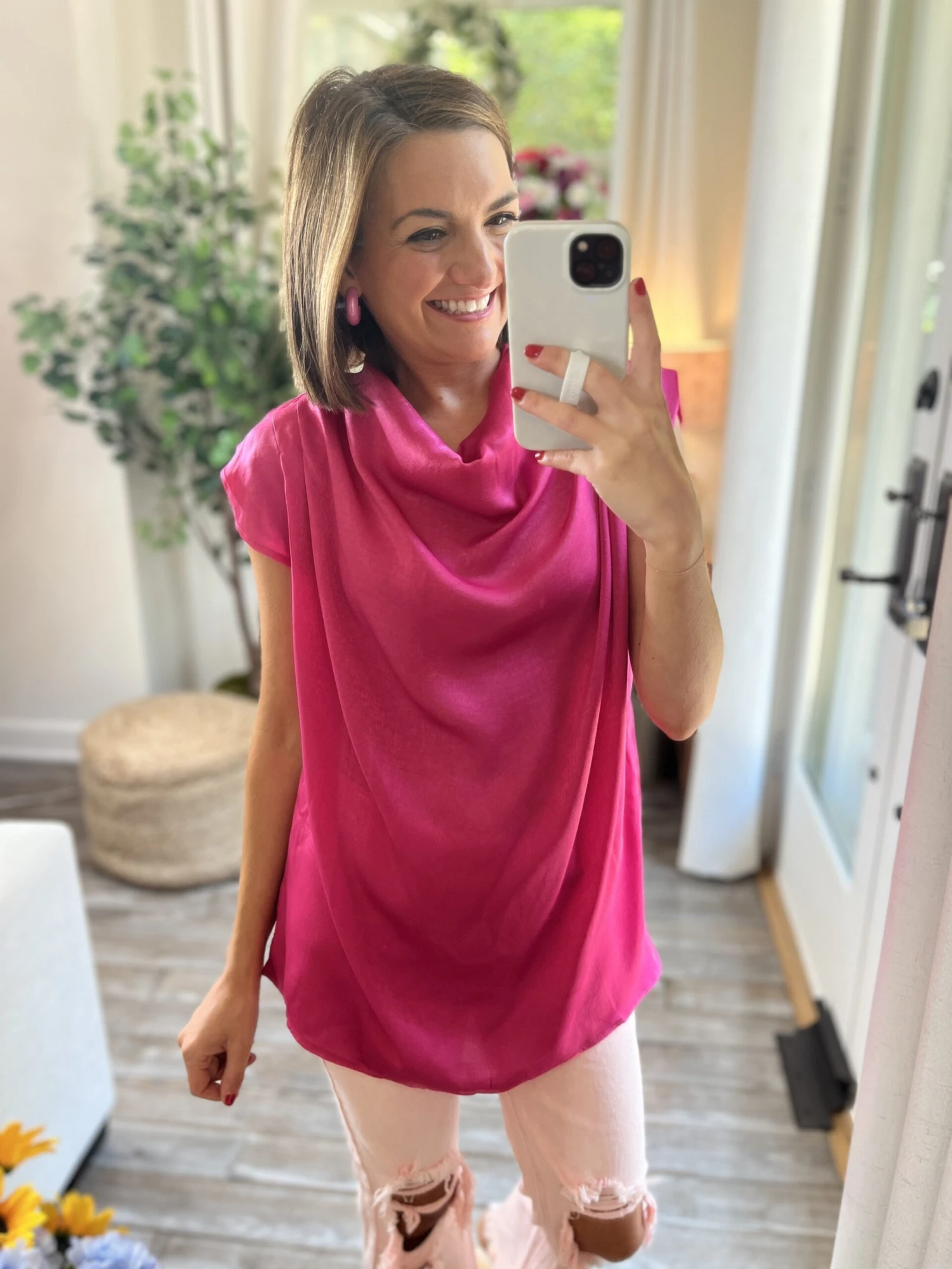 The “Returning Love Top” is just what you have been looking for! This stylish cowl neck design is beautifully bold and colorful! With some cute cap sleeves, you can channel your inner Barbie in this one! Don’t miss out here!