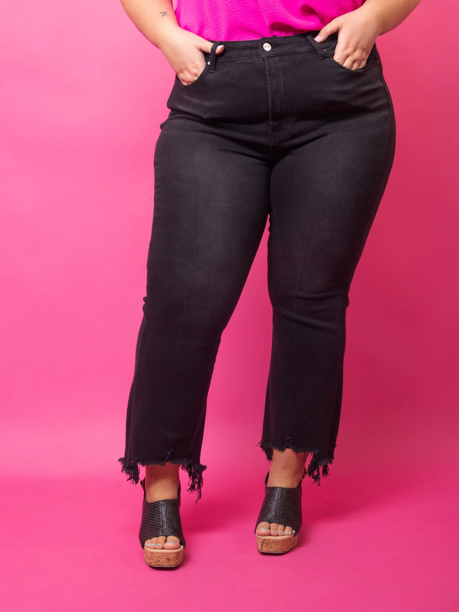 Features: Flare, High Rise, Frayed, Shark Bite Hem